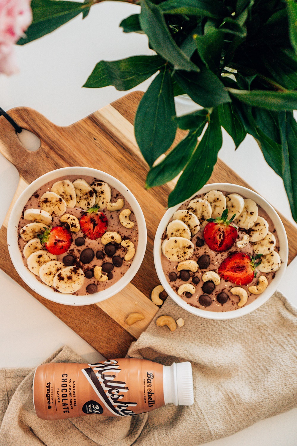 - koristeeksi: tuoretta banaania ja mansikoita, raakakaakaojauhetta sekä cashew-pähkinöitä