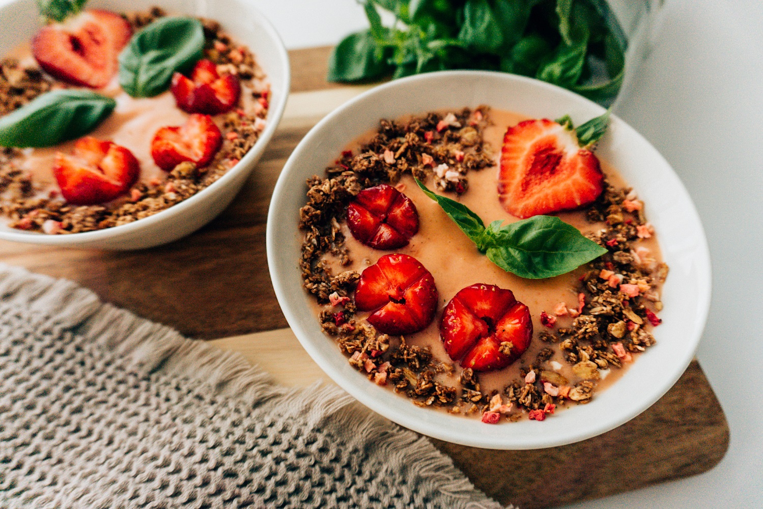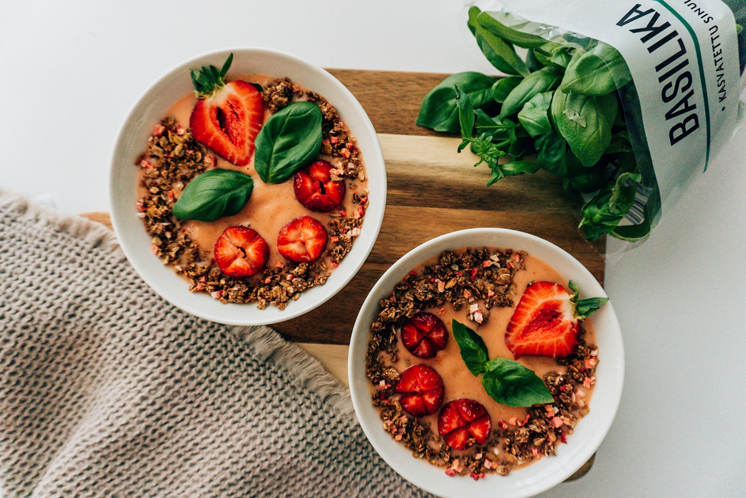 - koristeeksi: basilikan lehtiä, tuoreita mansikoita ja Fazerin mansikkaista kaakaogranolaa.