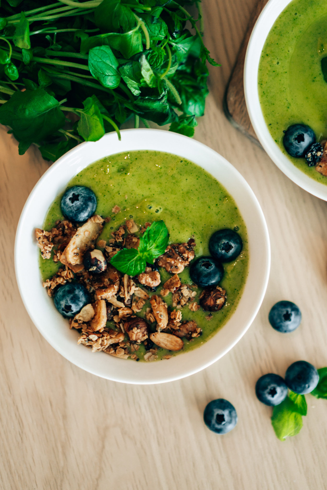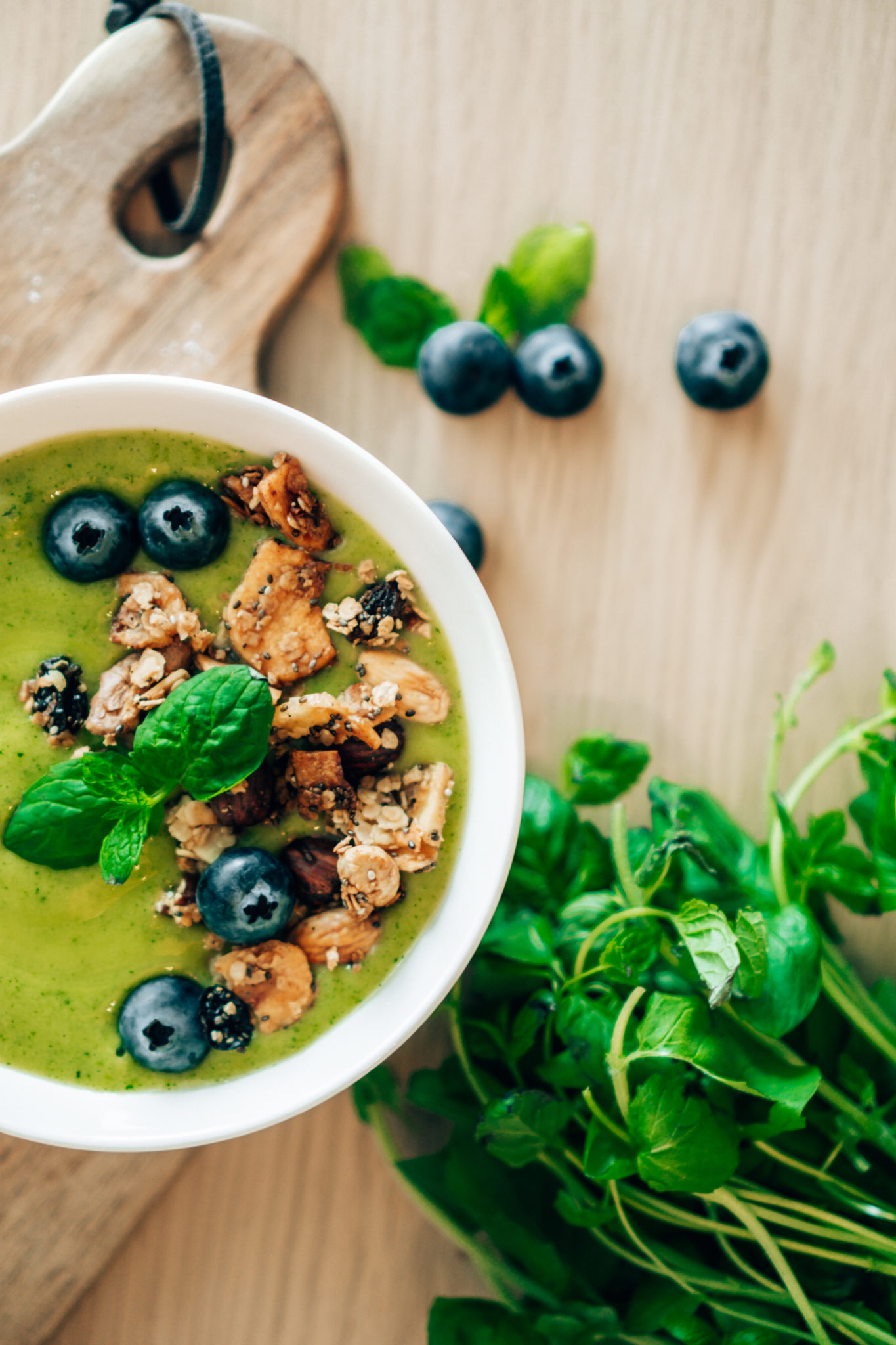 Sekoita kaikki blenderissä sekaisin ja kaada kulhoon. Laita päälle esimerkiksi itse tehtyä granolaa, mustikoita ja minttua. Tämän helpommaksi ei enää aamupalan teko voi mennä. ☀ Mehua kannattaa lisätä varovasti ja vähitellen, ettei rakenteesta tule äkisti liian juoksevaa. Muuten smoothien päälle tulevat päälliset uppoavat smoothien pohjaan. Jos en ole tehnyt itse granolaa, tykkään käyttää Fazerin ja Paulúnssin granoloita. Tuoreita marojoja löytyy ainakin näin kesän tullen runsaasti kauppojen hyllyistä ja toreilta. Mustikat sopivat todella hyvin tämän smoothien kanssa.