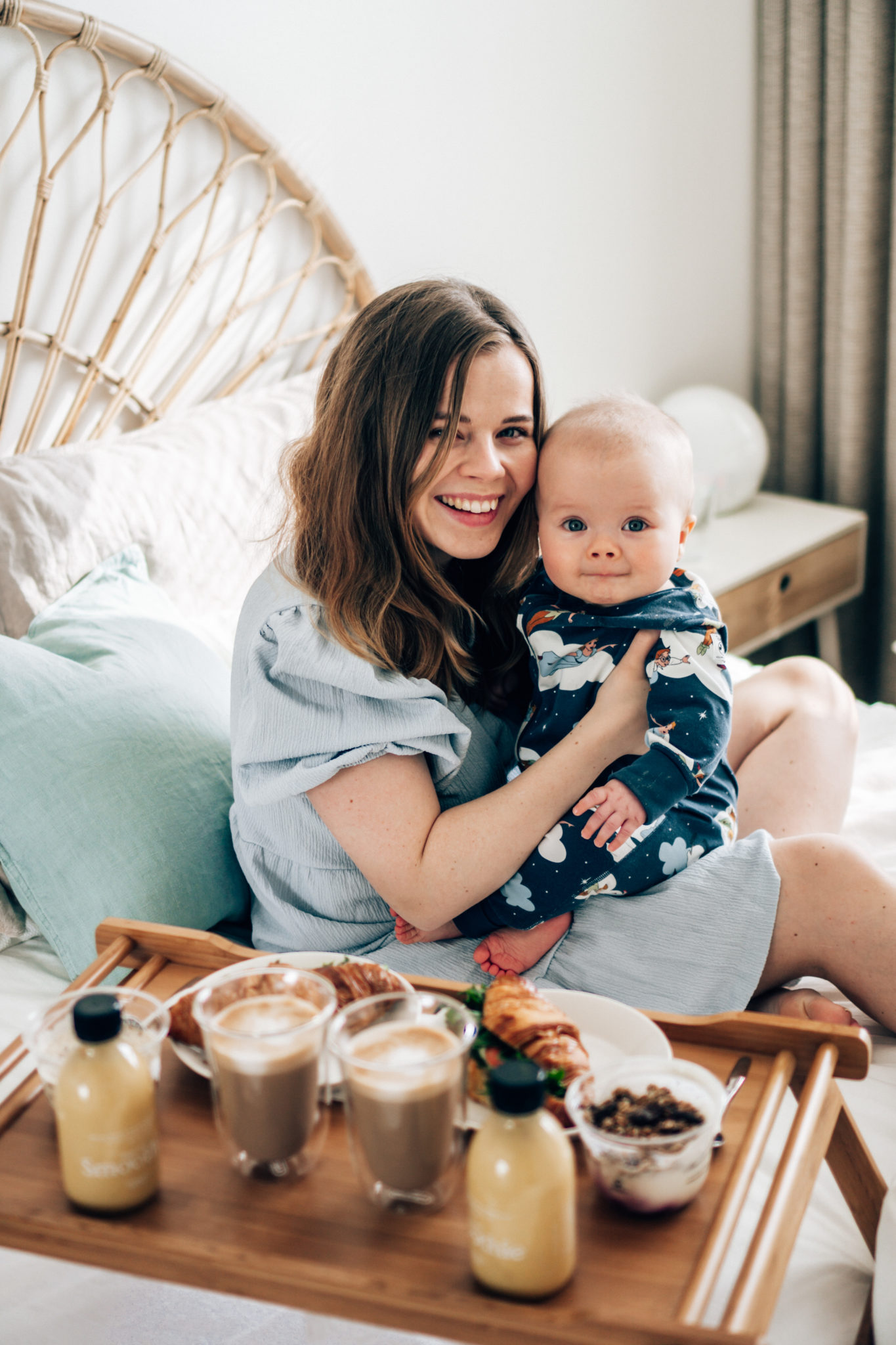Oltiin tilattu Espresso Housesta meille jo lauantaina illalla aamupalat valmiiksi jääkaappiin odottelemaan. Kuljetukset alkaa Woltilla sekä Foodoralla niin myöhään, että tällä tavalla saatiin syödä jo aikaisemmin aamulla aamubrunssi sängyssä. Syötiin aamiainen ja vieteltiin ihanaa äitienpäivän aamua kotosalla. Leivoin nopean marenkikakun, jota myös vähän maisteltiin. Lähdettiin iltapäivällä käymään vielä mun vanhempieni luona jossa oma äitini vietti ensimmäistä äitienpäivää mummina. Äiti oli leiponut myös kakun! ❤