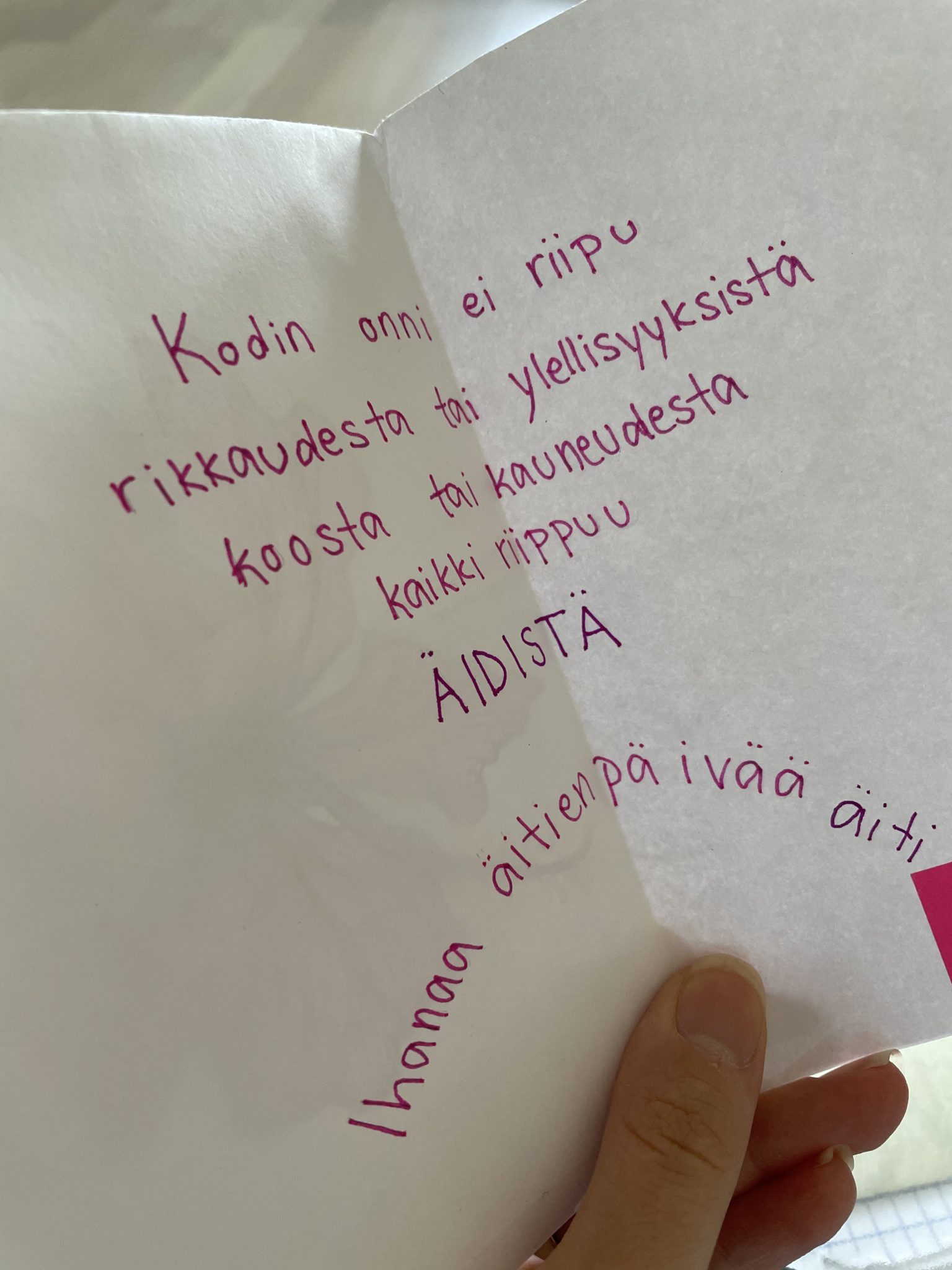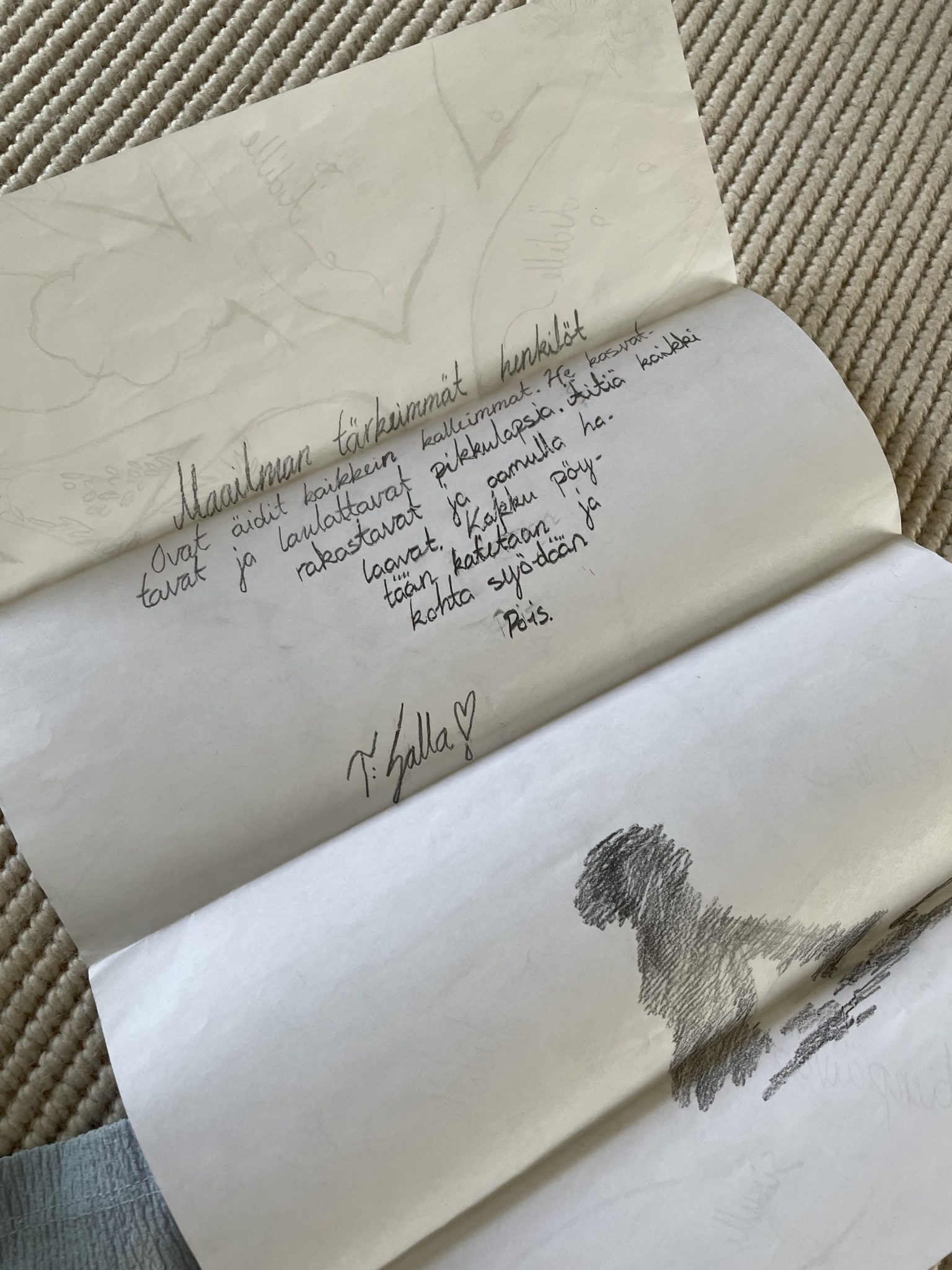 Ihan parasta oli myös löytää mun itse tekemiä vanhoja äitienpäiväkortteja. Näitä oli kyllä niin ihanaa lukea! Löysin myös vanhoja joulupukille tehtyjä listoja ja isänpäiväkortteja. Laitoin näitä näkyville Instan storyjen puolelle. Mun on aivan pakko kyllä säästää Saagankin tekemät kortit niin Saagakin voi joskus sitten nauraa vedet silmissä näille symppiksille luomuksille. ❤