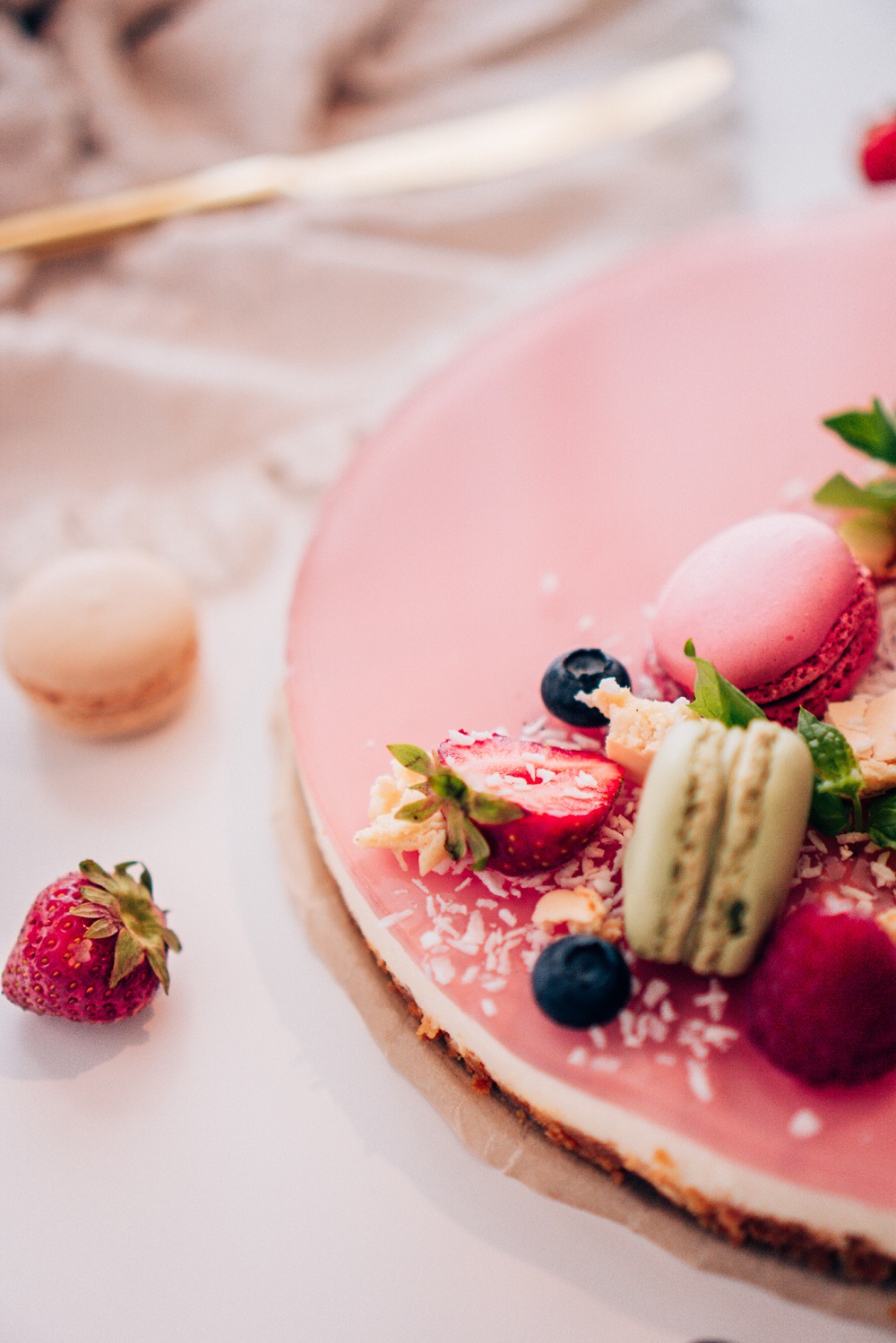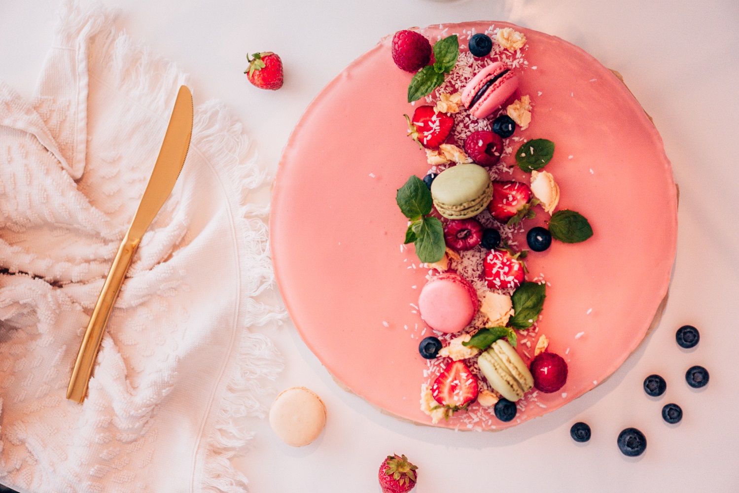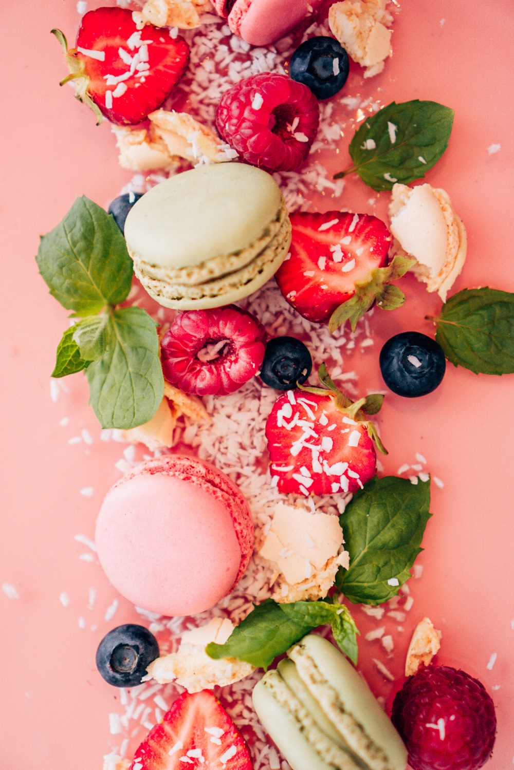- Koristele haluamallasi tavalla. Itse käytin koristeluun vadelma- ja pistaasimacaronsseja, kookoshiutaleita, mintun lehtiä sekä tuoreita mansikoita, vadelmia ja mustikoita ?