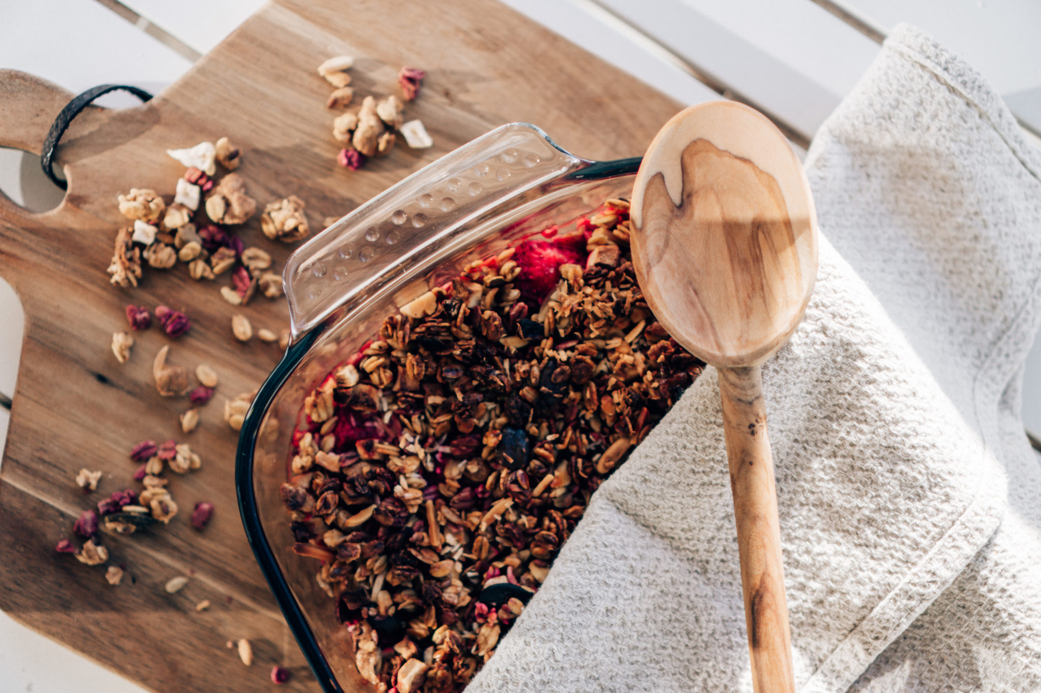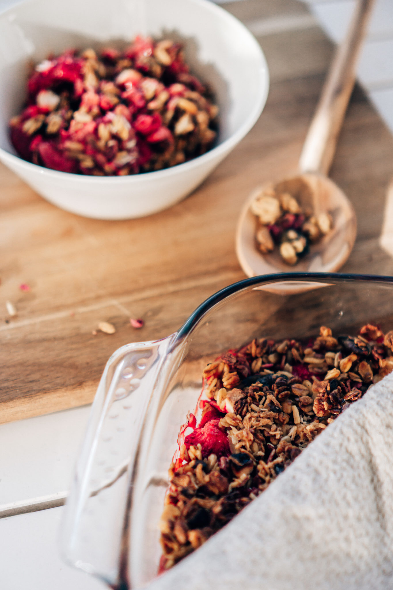 Tämän voi halutessaan tehdä myös helposti omenoista, päärynöistä tai vaikka marjasekoituksesta. Pakastemansikoiden sulaessa vuoan pohjalle tuli iso määrä nestettä, jonka takia tästä ei tullut yhtään kuivaa. Käytän itse usein Fazerin Alku-sarjan kauramyslejä tai Paulúnsin supermyslejä. Oma lempparini on kaneli, manteli ja omena granola Paulúnsilta.