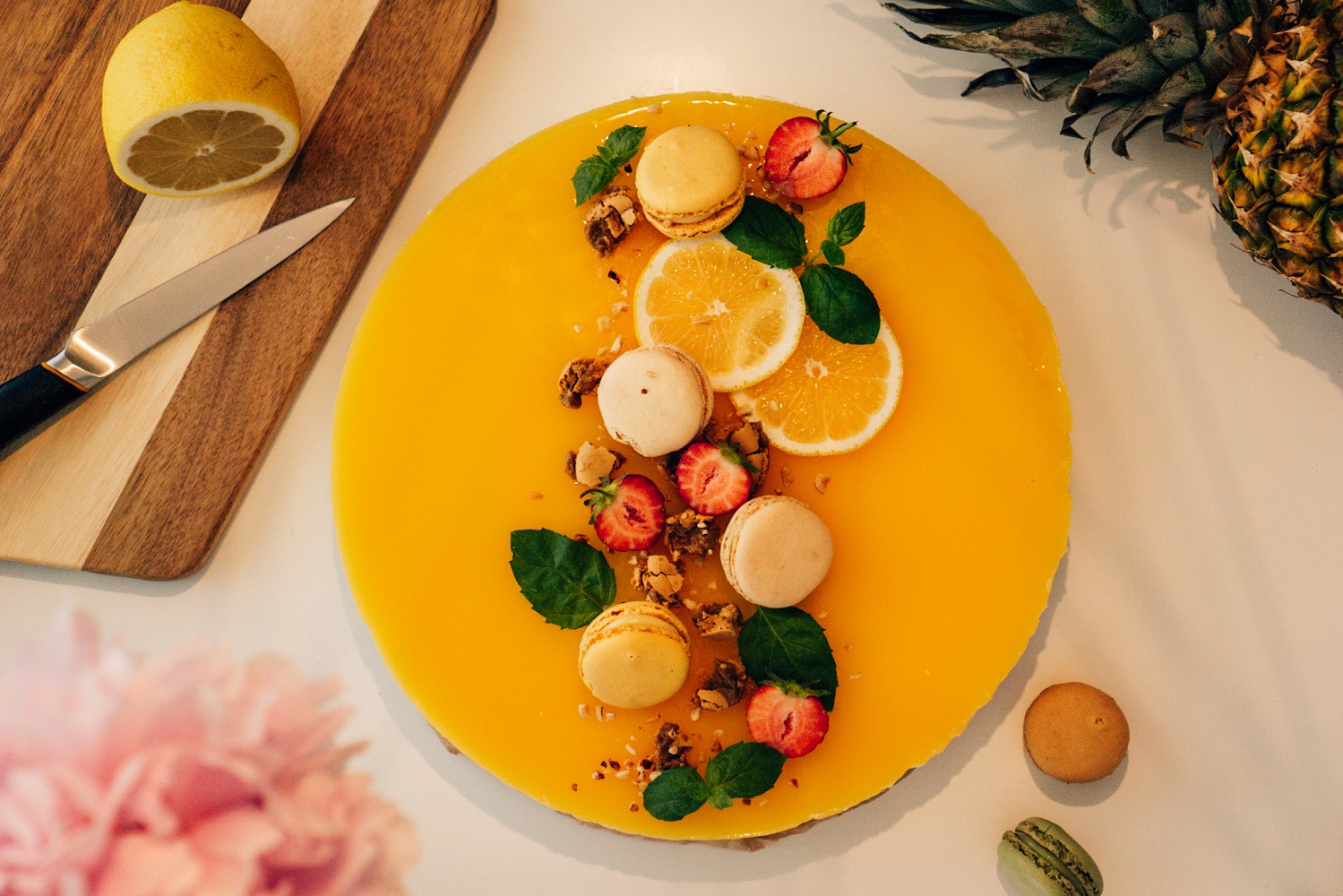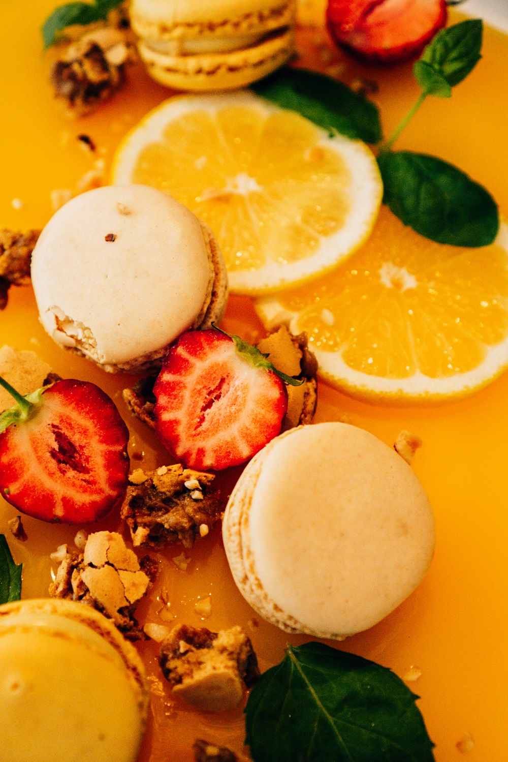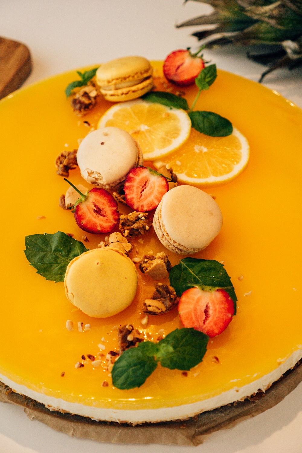 12. Koristele haluamallasi tavalla. Itse käytin koristeluun sitruuna- ja vaniljamacaronsseja, hasselpähkinärouhetta, sitruunan siivuja, mintun lehtiä sekä tuoreita mansikoita ?