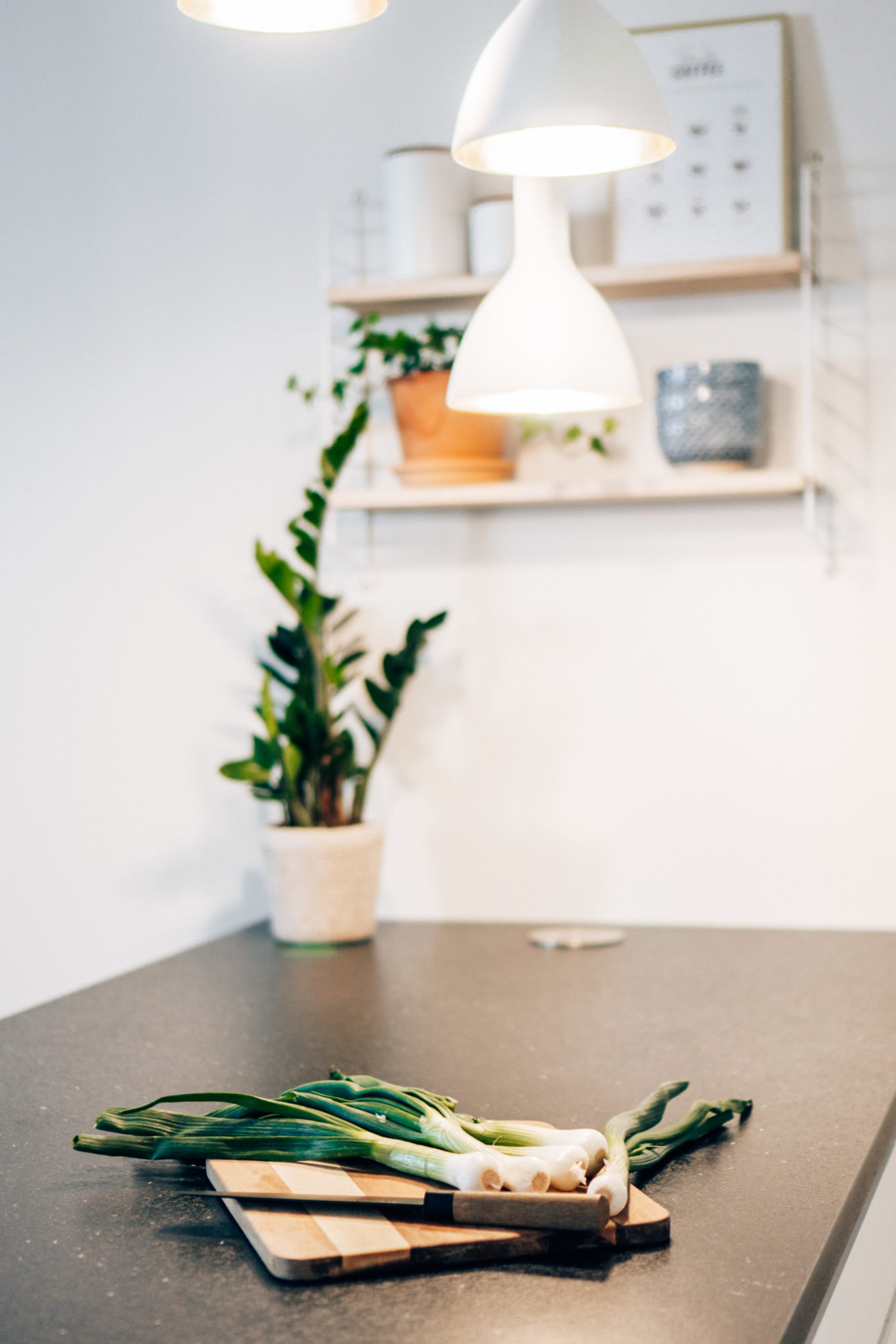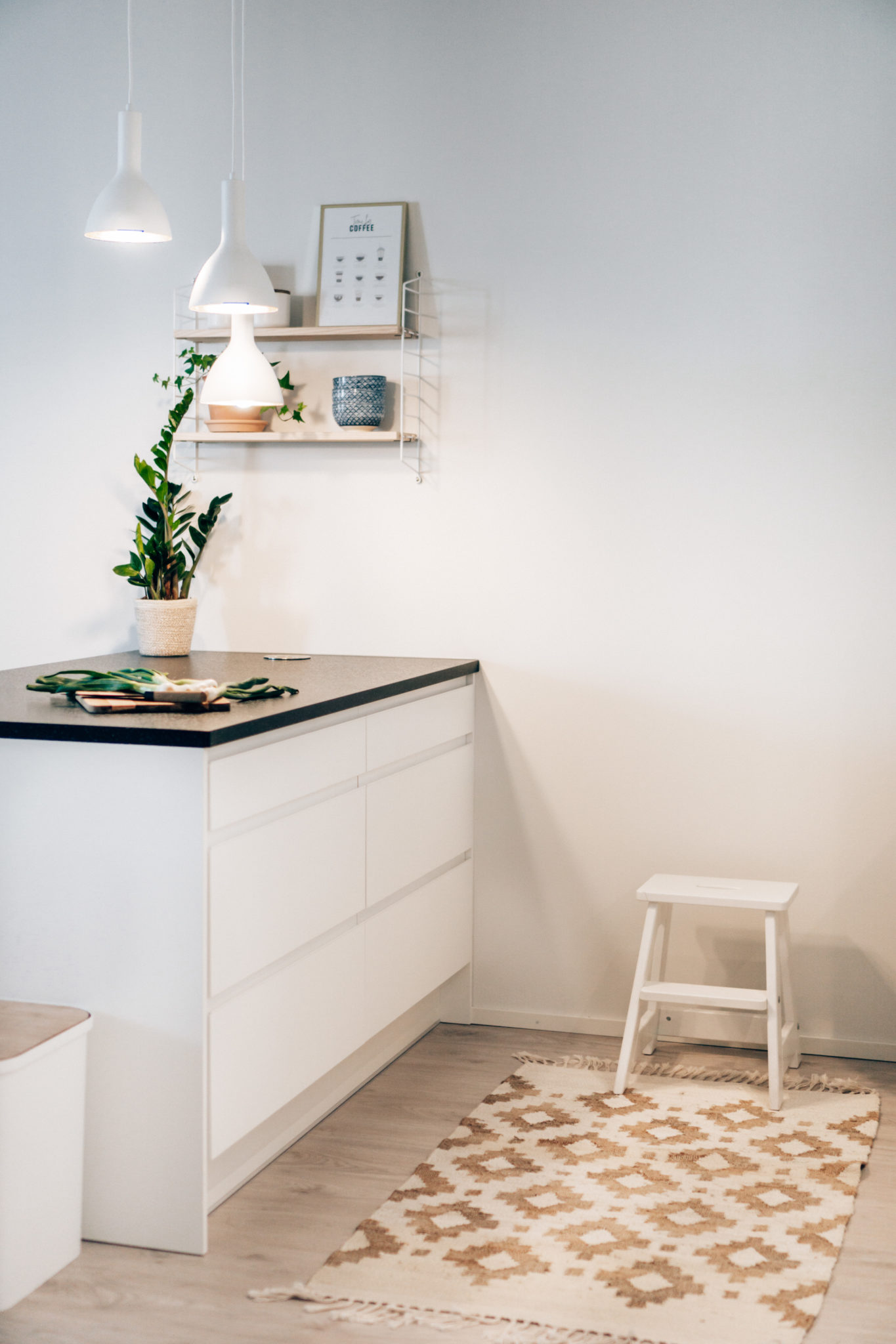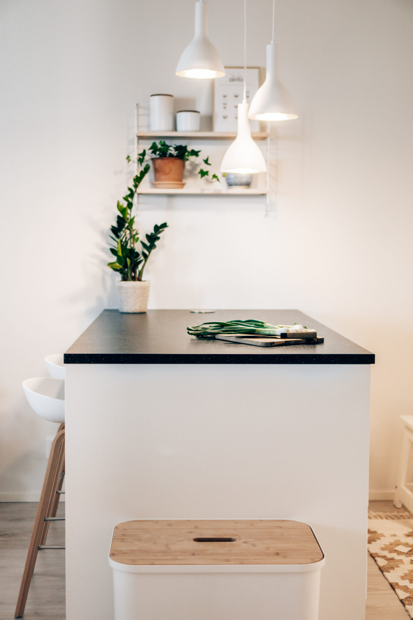 Saarekkeen yläpuolella oleva String Pocket hylly on hankittu Finnish Design Shopista. Hyllyn väri on saarni-valkoinen ja hyllyyn kuuluu kolme hyllylevyä. Meidän mielestä hylly kuitenkin näyttää paremmalta kahdella hyllylevyllä. HAY:n baarijakkarat ovat myös hankittu samasta paikasta. Saarekkeen riippuvalaisimen Markus hankki nettilamppu.fi sivustolta, koska itse olin pähkäillyt valaisimen kanssa jo monta kuukautta, palauttanut muutaman ja pähkäillyt taas. No nyt meillä on valoa eikä valaisin itse asiassa ole yhtään hassumman näköinen! Onneksi miehelläkin on hyvä sisustusmaku. ?