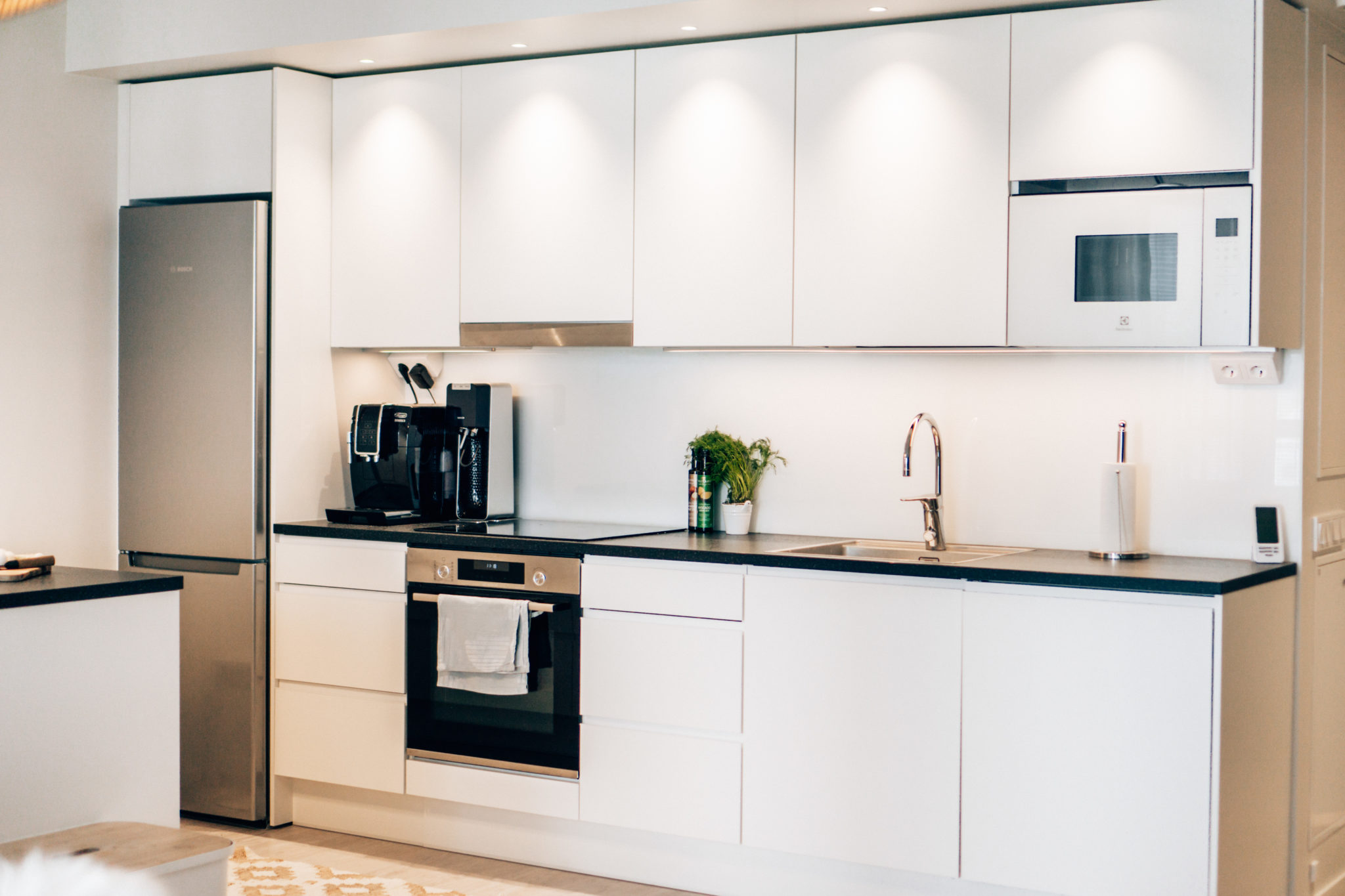 Tykkään meidän keittiön mallista. Toki me ei saatu tähän juurikaan vaikuttaa, joten hyvä, että kerralla tuli hyvä. Valaisinpaikka oli toki vinossa ja sen kanssa oli hieman säätämistä. Keittiössä toimivuus on mun mielestä kaikista tärkeintä. Uunin ja pesualtaan vieressä on oltava laskutilaa, pistokepaikkoja täytyy löytyä jokaisesta keittiön kulmasta sekä saarekkeesta, pesukone on oltava tiskialtaan vieressä, saarekkeesta täytyy löytyä säilytystilaa sekä päästävä istumaan. Onneksi kaikkiin näihin kohtiin saan vetää ok merkin!