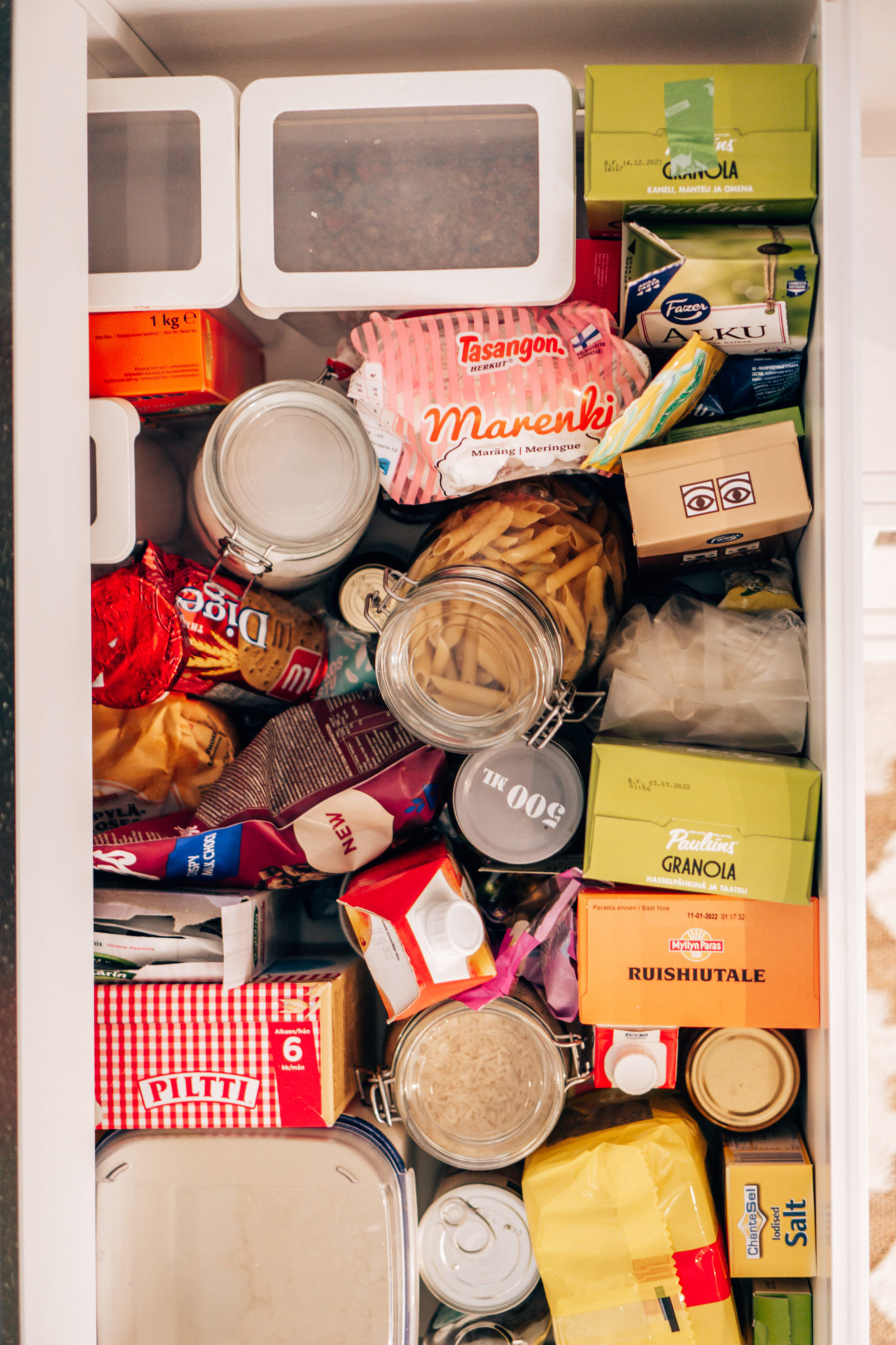 Tässä laatikossa me säilytetään meidän kaikki kuivatavara riiseistä kuivattuihin hedelmiin ja mysleistä jauhoihin. Mua alkoi ärsyttämään, kun kaapista ei enää löytänyt mitä oli etsimässä ja osa tavaroista piti ottaa pois, ennen kuin sait pohjalta haluamasi. Lisäksi aamiaistarvikkeet hukkuivat leivontatarvikkeiden sekaan. Löysin myös parhaimmillaan kolme avattua pakettia samaa tuotetta. Päivämäärät me oltiin katsottu jo muuton yhteydessä, joten ne olivat kunnossa.