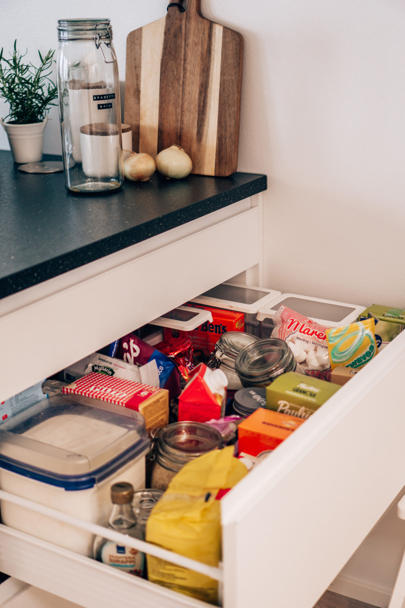 Tässä laatikossa me säilytetään meidän kaikki kuivatavara riiseistä kuivattuihin hedelmiin ja mysleistä jauhoihin. Mua alkoi ärsyttämään, kun kaapista ei enää löytänyt mitä oli etsimässä ja osa tavaroista piti ottaa pois, ennen kuin sait pohjalta haluamasi. Lisäksi aamiaistarvikkeet hukkuivat leivontatarvikkeiden sekaan. Löysin myös parhaimmillaan kolme avattua pakettia samaa tuotetta. Päivämäärät me oltiin katsottu jo muuton yhteydessä, joten ne olivat kunnossa.