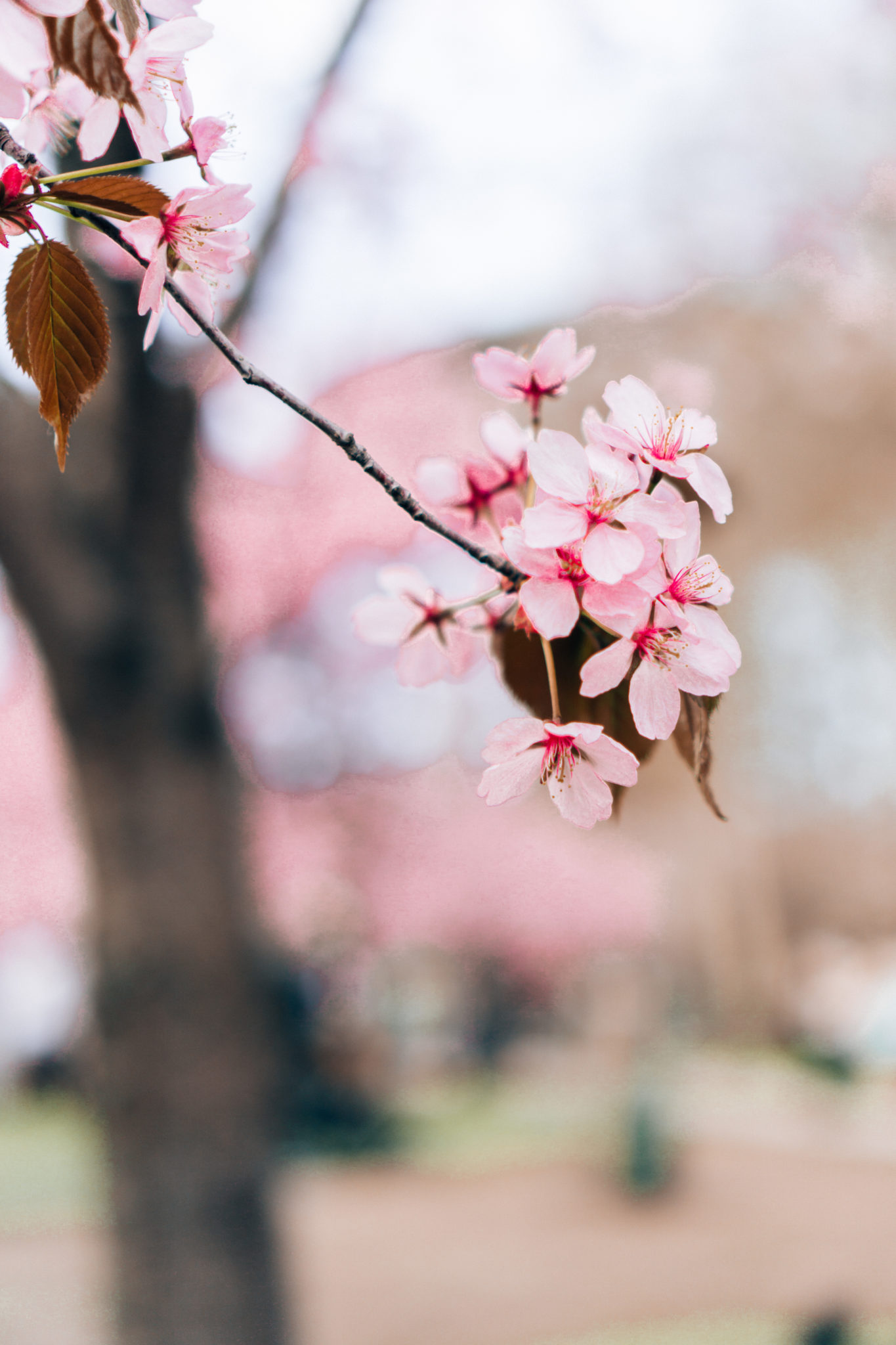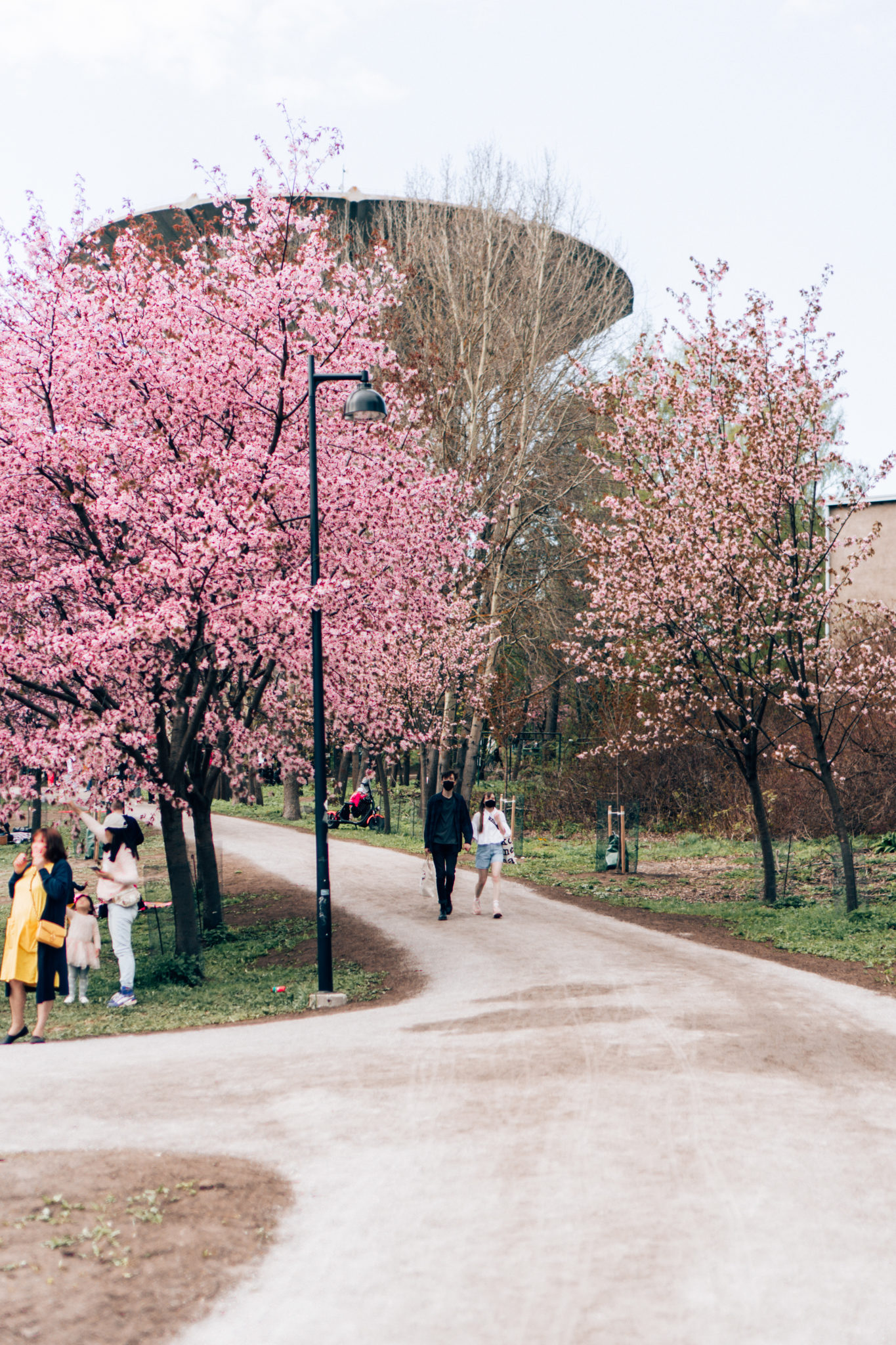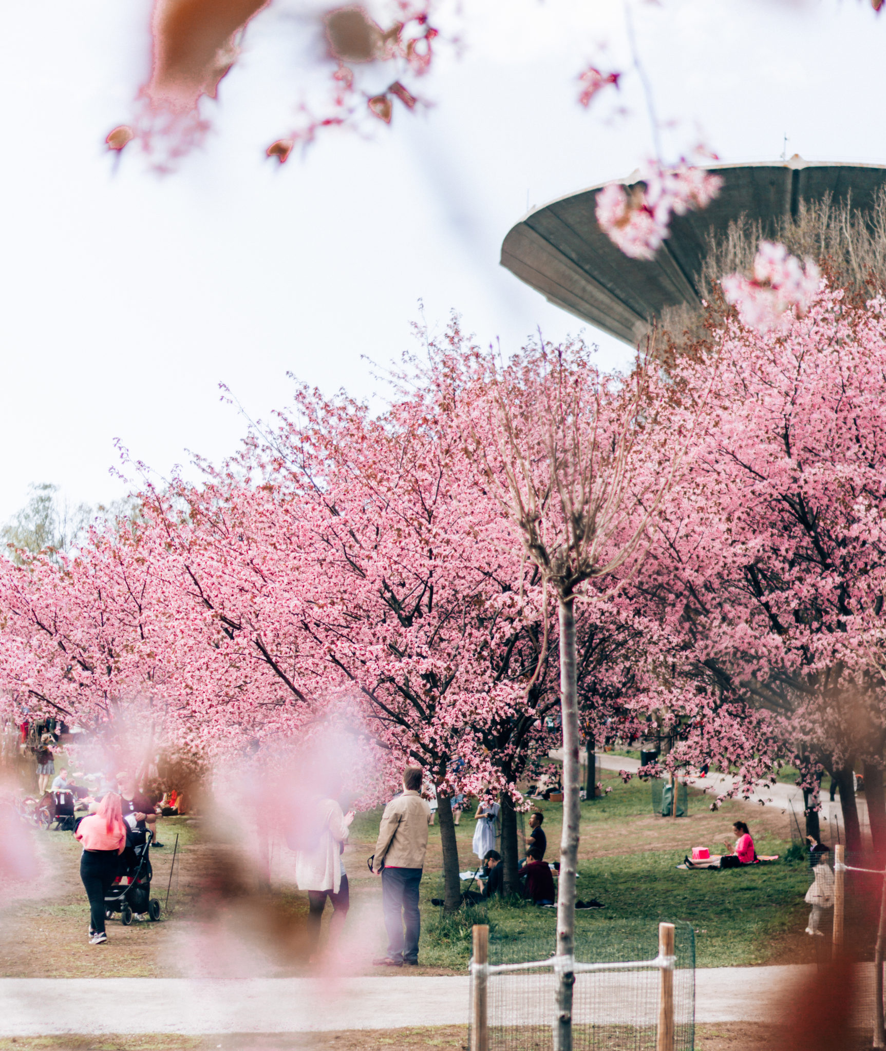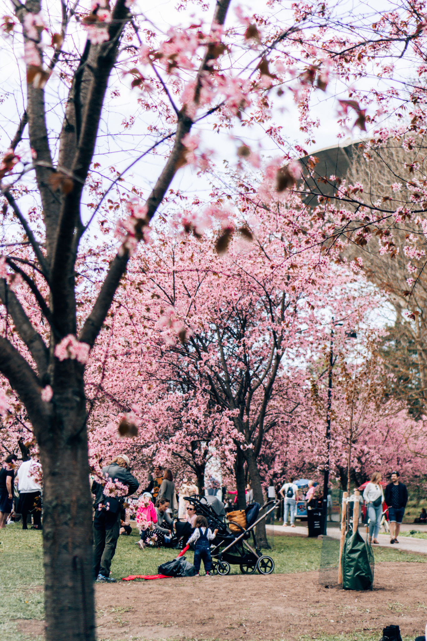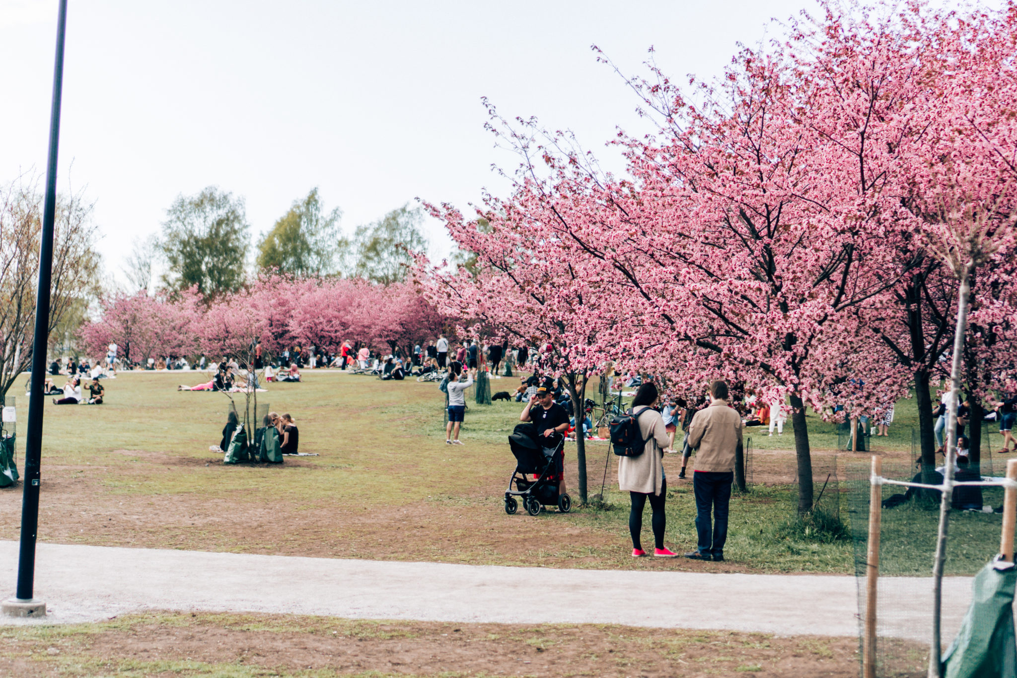 Aika ihanaa, että meidän uudesta kodista on ihan kävelymatka tänne Roihuvuoren kirsikkapuistoon. Kun käveltiin puistoa kohti nähtiin jo pitkältä kuinka paljon ihmisiä oli kasaantunut ihastelemaan näitä kauniita puita. Puihin oli kiinnitetty kylttejä, joissa kehotettiin pitämään riittävää turvaväliä ja pitämään puut rauhassa. Paikalta sai ostaa myös jäätelöä. Kieltämättä tuntui siltä, että nyt ei olla enää Suomessa. Väkeä oli paljon. Oli koiria, lapsiperheitä, pariskuntia, raskauskuvia ottavia tulevia äitejä, kimonoihin pukeutuneita naisia sekä kaveriporukoita. Todella hyvin ihmiset tajusivat pitää aika isojakin turvavälejä sekä moni piti myös maskia.
