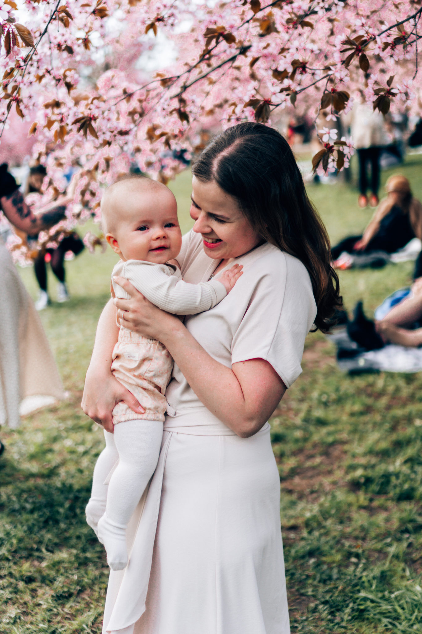 Vuosi sitten me oltiin Saagan kummitädin kanssa piknikillä täällä samaisessa kirsikkapuistossa, jossa eilen käveltiin katuja rattaiden kanssa. Mulla oli juuri ollut rakenneultra jota olin jännittänyt ihan kamalasti. Muutama kyynel siinä vierähti, kun kuulin, että kaikki on hyvin ja terve tyttö on tulossa. Kaikki se jännitys ja stressi purkautui ja vieläkin tuota viime vuoden kuvaa katsellessa muistan sen kevyen tunteen. ❤ Stressi ja pelko sairaasta lapsesta oli kadonnut ja ajatukset vaihtuneet toisenlaisiin mietteisiin. Muistan ne fiilikset joita pyörittelin päässäni läpi. Onko musta äidiksi? Millaista se lapsiperheen arki sitten on? Miten parisuhteelle tulee käymään? Entä jos lapsi vain itkee ja itkee, miten minä sitten jaksan? No Saagahan on yllättänyt meidät helppoudellaan, iloisuudellaan ja kaikin puolin vauva-arki on ollut ihanaa. Kyllähän niitä hetkiä on ollut, kun tekee mieli huutaa ja mielessään vaan pohtii mikä ihme tuolla pikkutyypillä taas on, mutta onneksi ne ajat ovat ainakin hetkeksi takanapäin. Arki ja itkut ovat helpottuneet kummasti Saagan kasvaessa.
