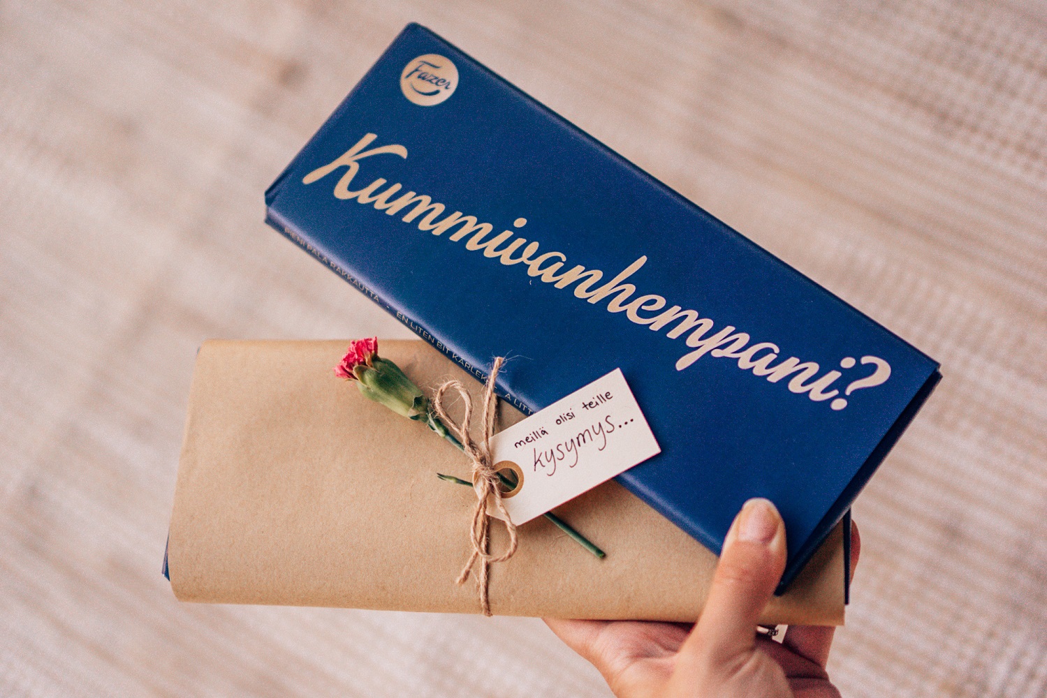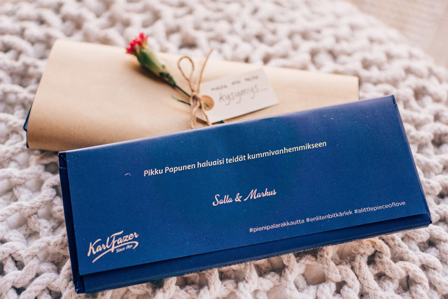 Sain idean Facebookista, kun näin mainoksen Fazerilta räätälöidystä suklaalevystä. Ajattelin, että tuohan olisi aivan ihana tapa tehdä kummikutsut! Menin Fazerin sivuille ja aloin miettimään mitä ihanaa tähän kääreeseen voisi kirjoittaa. Takakanteen sai melko lyhyen kirjoituksen tehtyä ja aluksi ajattelin, että olisi ollut kiva kirjoittaa hieman pidempi teksi. Hyvä tästä kuitenkin tuli! 🙂 Kääreeseen hain tarpeet Sinellistä sekä Clas Ohlsonilta. Kaikki kummit suostuivat, joka tietysti oli pääasia, mutta oli kiva tehdä kummikutsut hieman erilaisella tavalla. <3 Nyt voi tulevat kummivanhemmat heittää jalat pöydölle ja nauttia suklaasta, kun ei vielä kiusata kaiken maailman kysymyksillä ?.