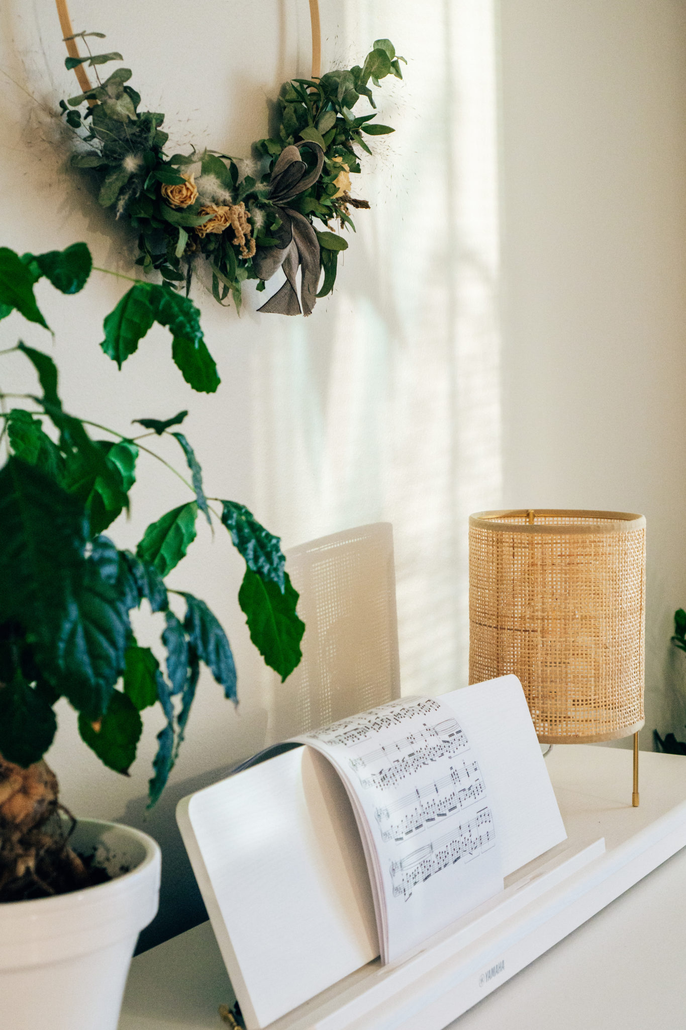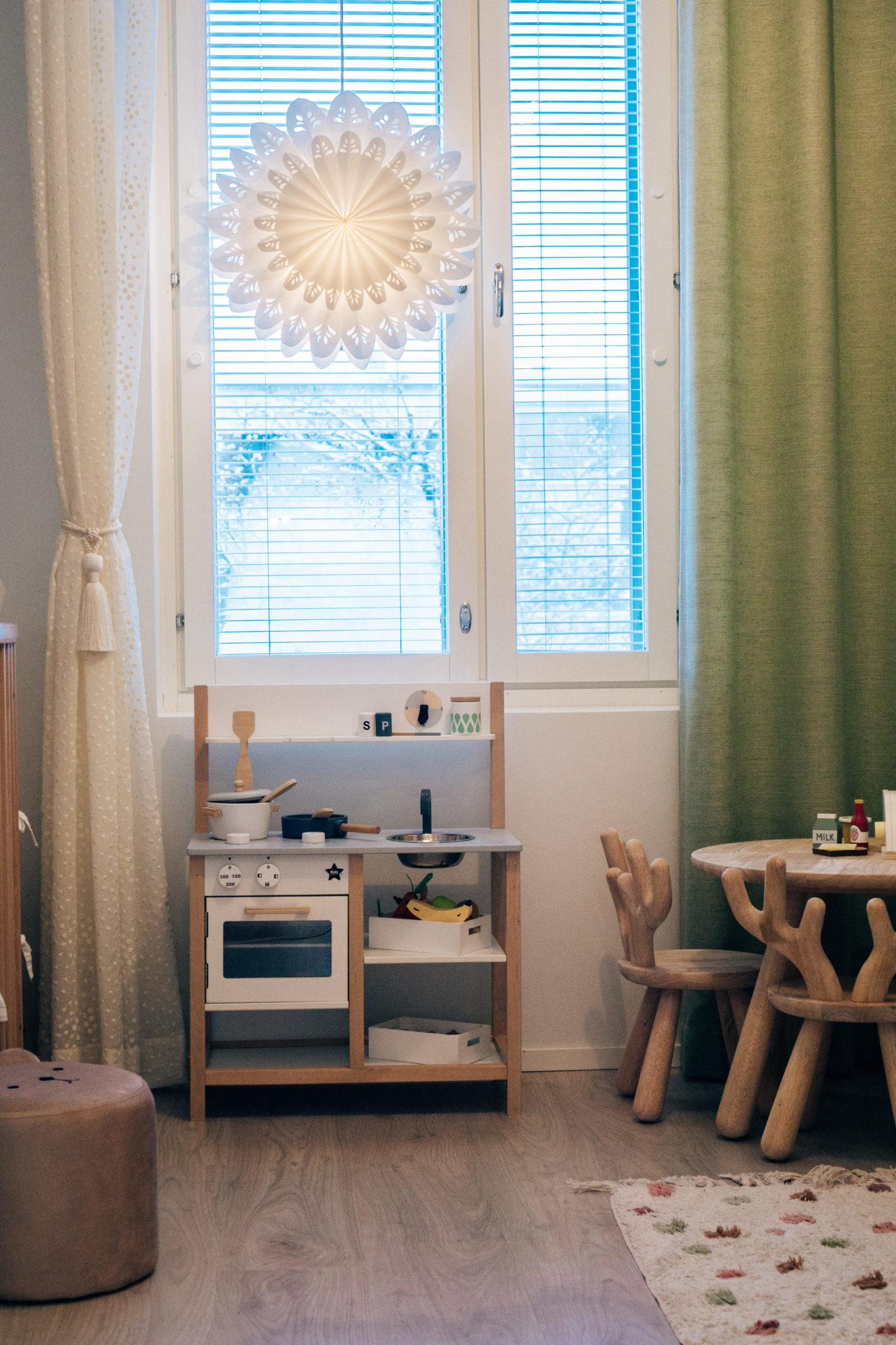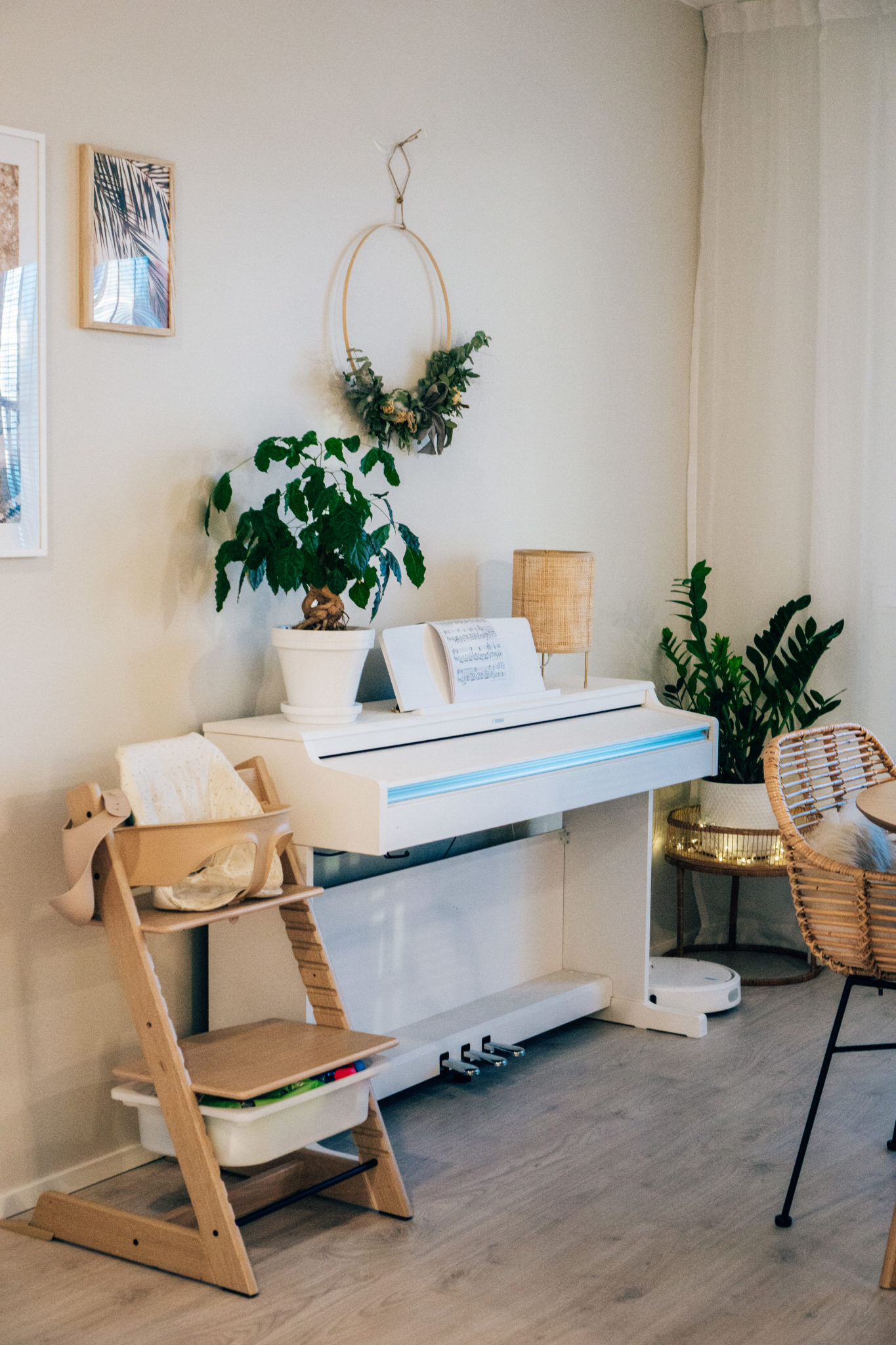 kattovalaisin: Ellos, ruokapöytä: Jysk, tuolit: HobbyHall, lipasto: Lundia, julisteet: Desenio, sähköpiano: verkkokauppa.com, pöytävalaisin: Jysk