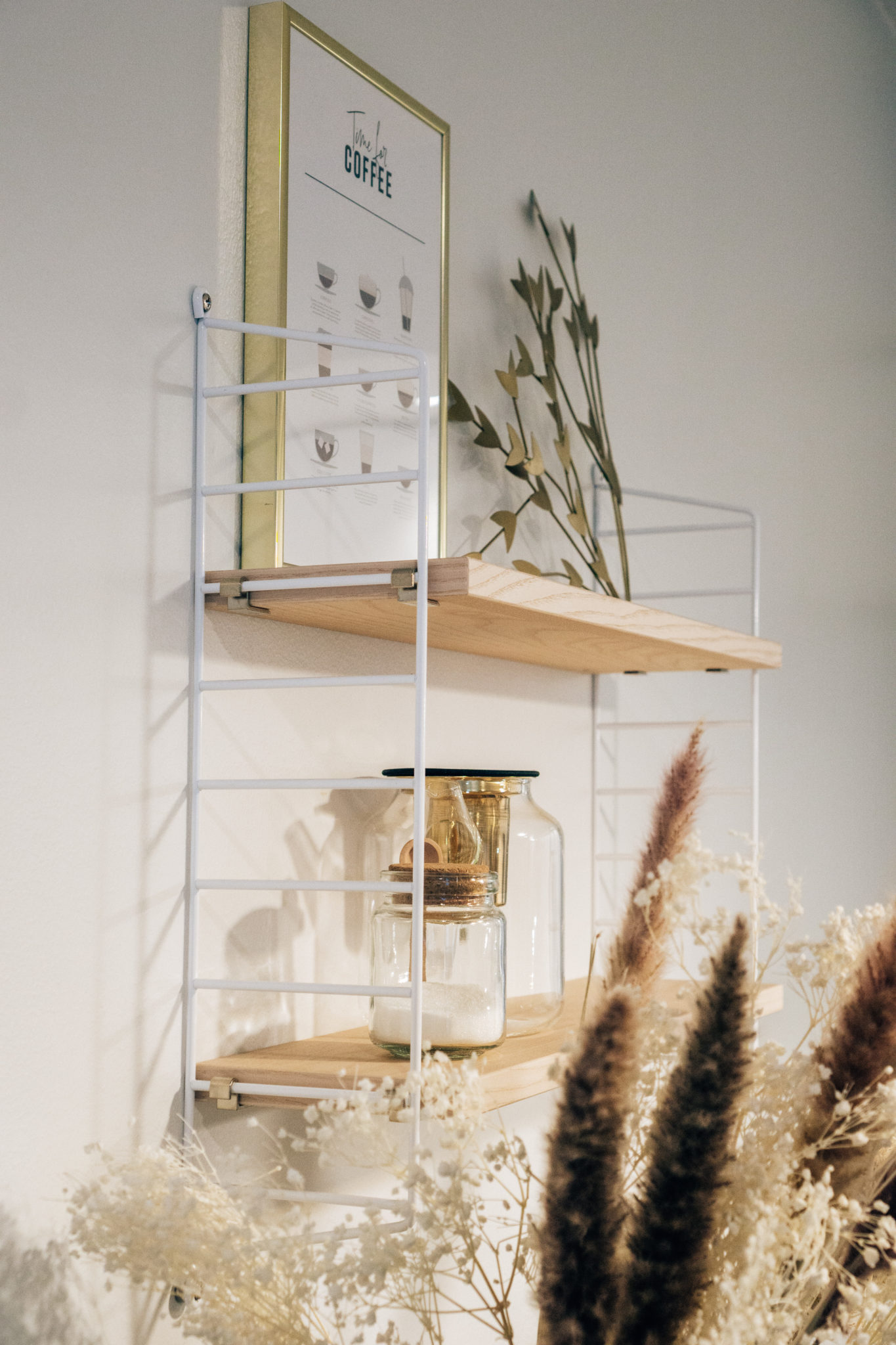 Olohuoneen puolelle me laitettiin joulukuussa hyllyt seinälle. Seinä oli jo pitkään kaivannut vähän jotain muuta kuin valkoista enkä malta odottaa, että pääsen nyt täyttämään sen viherkasveilla ja väriä tuovilla maljakoilla ja kynttilöillä. Edelleen mä haluaisin maalata tuon seinän jollain hennolla sävyllä ja päällimmäisenä mielessä on hailakka oliivin vihreä. Katsotaan saadaanko me sitä ikinä tehtyä, mutta se kyllä toisi tähän tilaan tosi paljon.