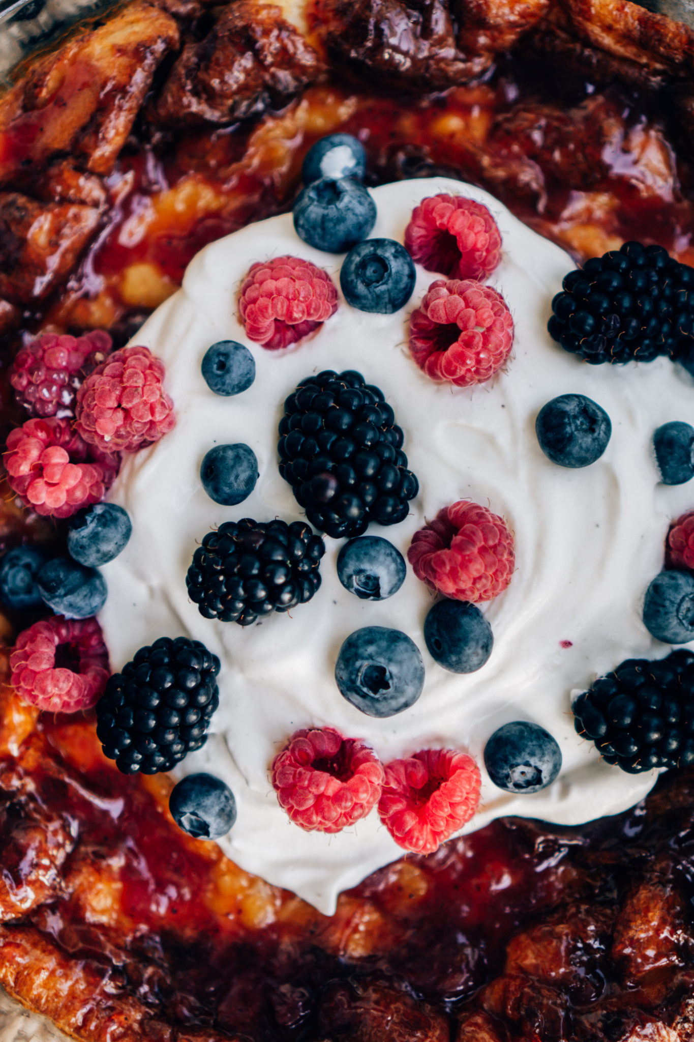 6. Levitä hilloa ja nostele kermavaahtoseosta pannarin päälle. Asettele vielä marjat.