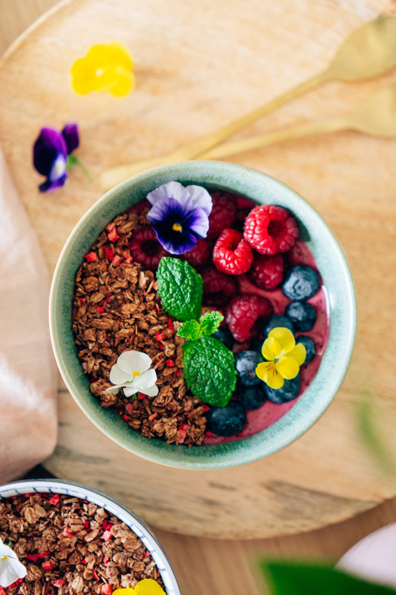Smoothiebowlien päällä Fazerin mansikka-kaakao granolaa, Mimis syötäviä kukkia, mustikoita, vadelmia ja minttua.