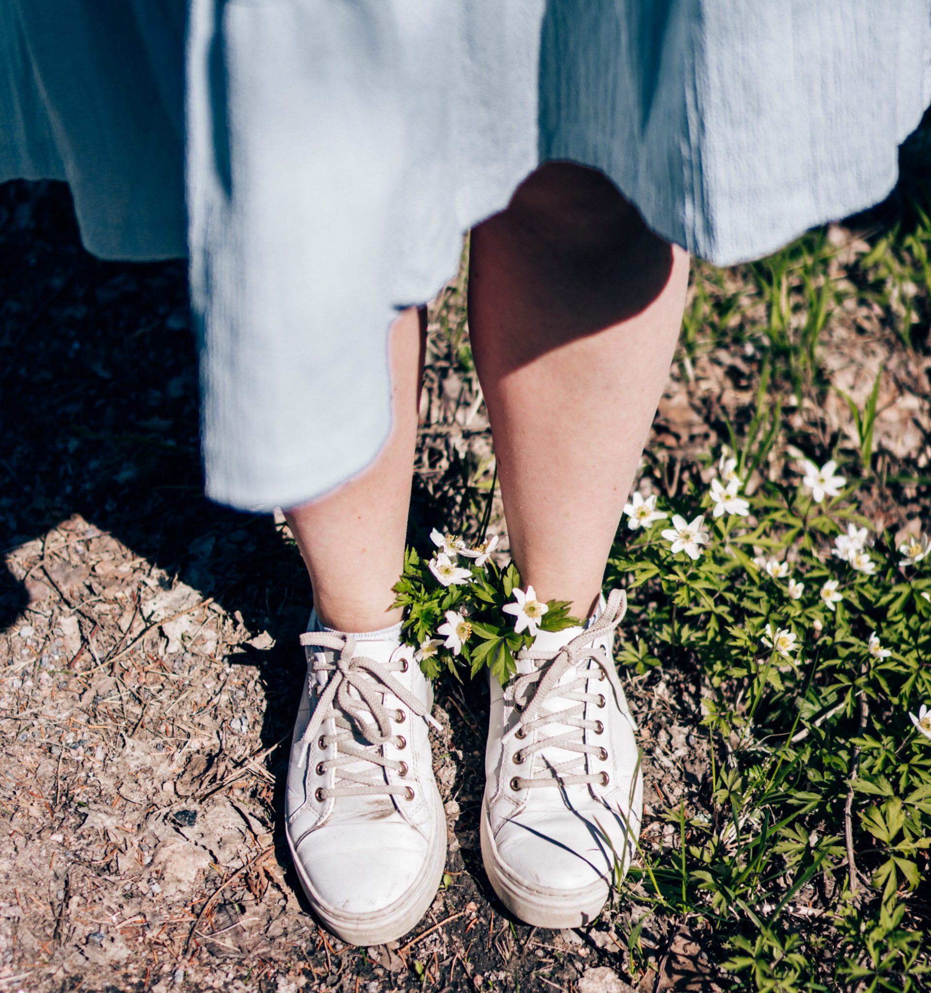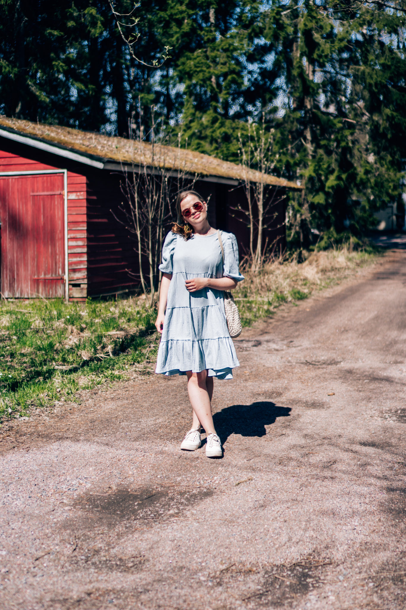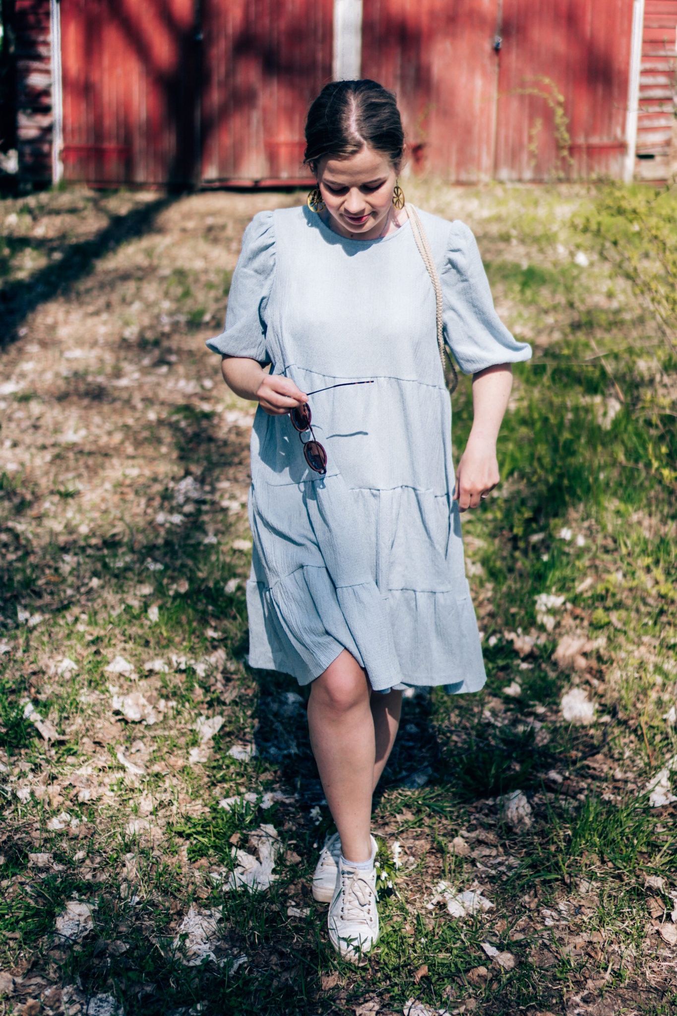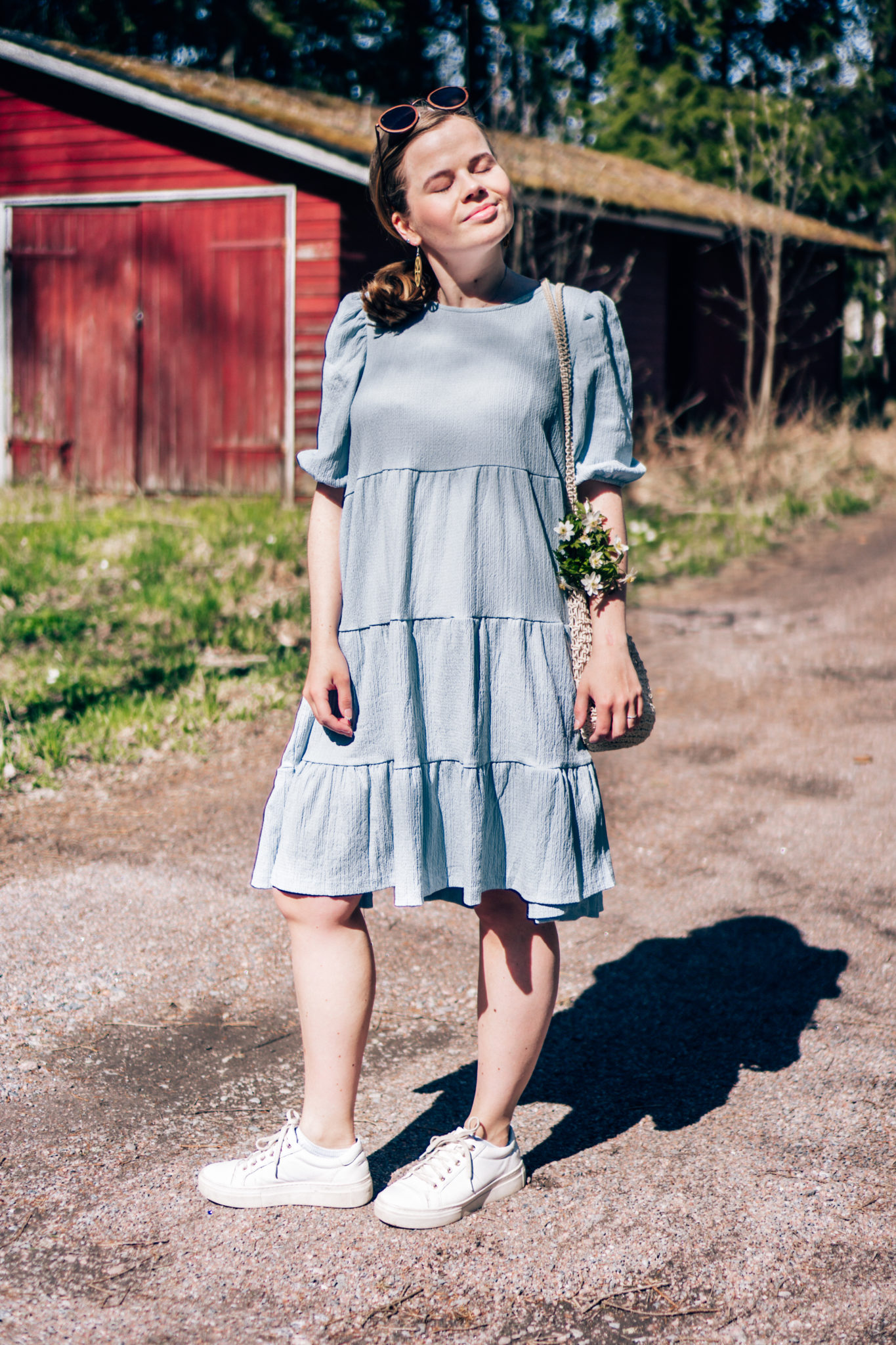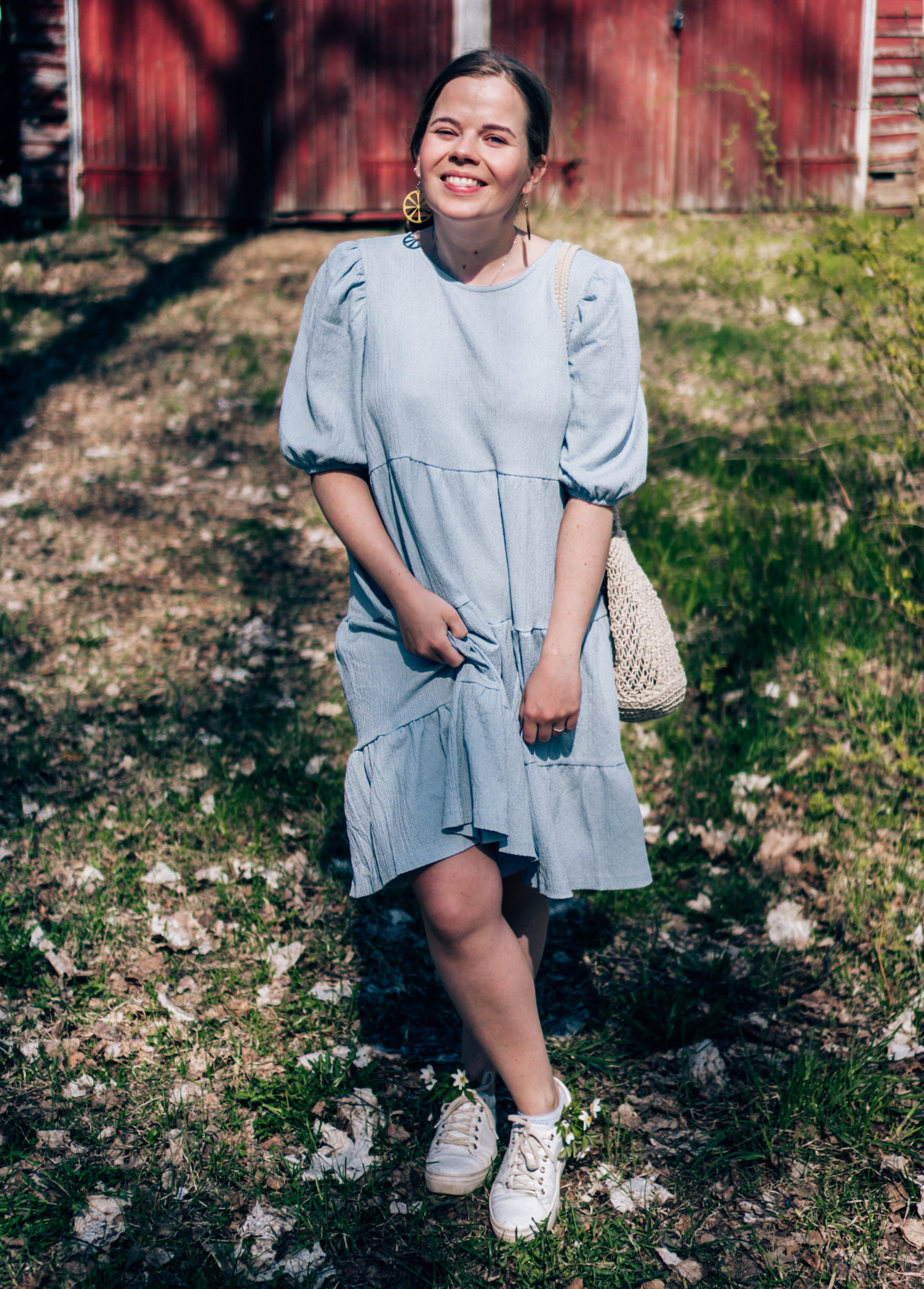 Tämän päivän kesäasu on Monkin mekko! Ihanan kevyt ja hihat ovat aivan superit. Ei liian pallomaiset, mutta juuri sopivat. Poltan myös melkein joka vuosi mun hartiat, joten tämä suojaa niitäkin kivasti. Sävy on ihanan hempeä ja tämän kanssa sopii niin monet eri värit. Keltaiset sitruunakorvikset sopi mielestäni melko täydellisesti ja teki mekosta vieläkin kesäisemmän. Valkoiset tennarit on mulla ollut käytössä jo melkein koko alkuvuoden ja tekee tästäkin asusta ihanan arkisen. Kesällä todennäköisesti kuitenkin sandaalit vaihtuvat tennareiden tilalle.