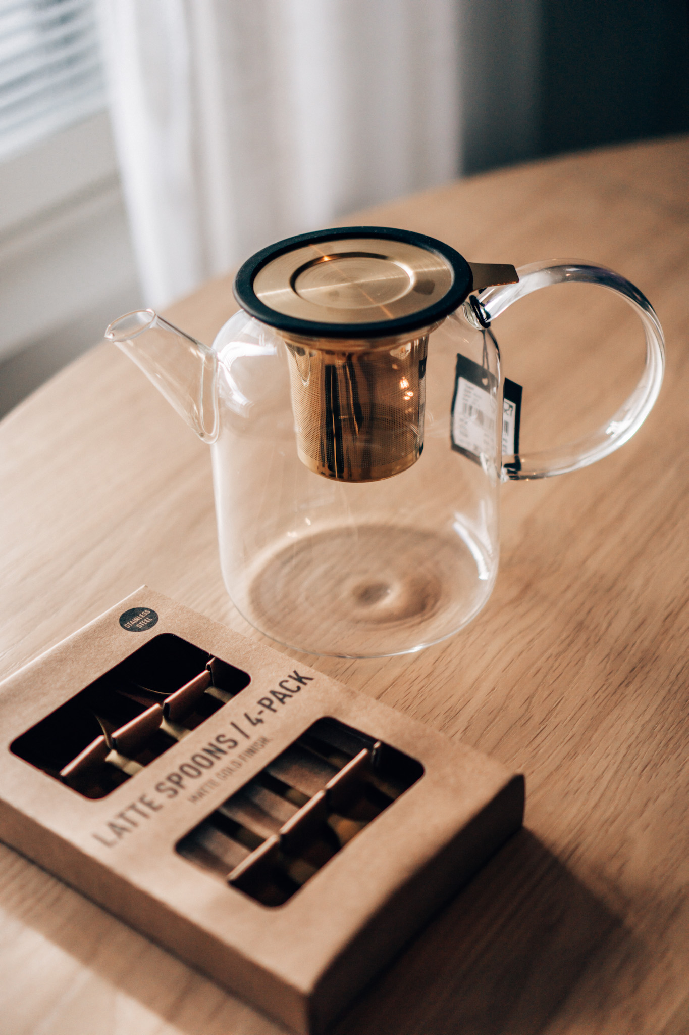 *Hemtexissä on myös kaikki keittiötarvikkeet sekä piensisustustuotteet -40%! Nyt mulla tarttui mukaan nämä *kullatut pitkät lusikat ja *teepannu. Ihanaa, kun voi tehdä isomman määrän teetä samalla kertaa eikä tarvitse olla koko ajan tekemässä kuppi kerrallaan. Tarjoiluelämys on myös aika upea, kun teen näkee kannusta läpi. Ostin myös pitkiä kultaisia lusikoita lisää, jotka sopii meidän korkeisiin lasimukeihin. Juodaan joka viikko jääkahveja korkeista lasimukeista, joten nämä olivat ihan täydellinen alelöytö meille. Teesiivilät, mukit, kullatut pillit, pöytäliinat, kulhot, jne. Pöytä oli täynnä ihania alelöytöjä. Mulla pisti silmään myös muutama pyöreä peili, ihanat juuttimatot ja rottinkiset säilytyskorit, jotka on nekin kaikki -40% alessa.