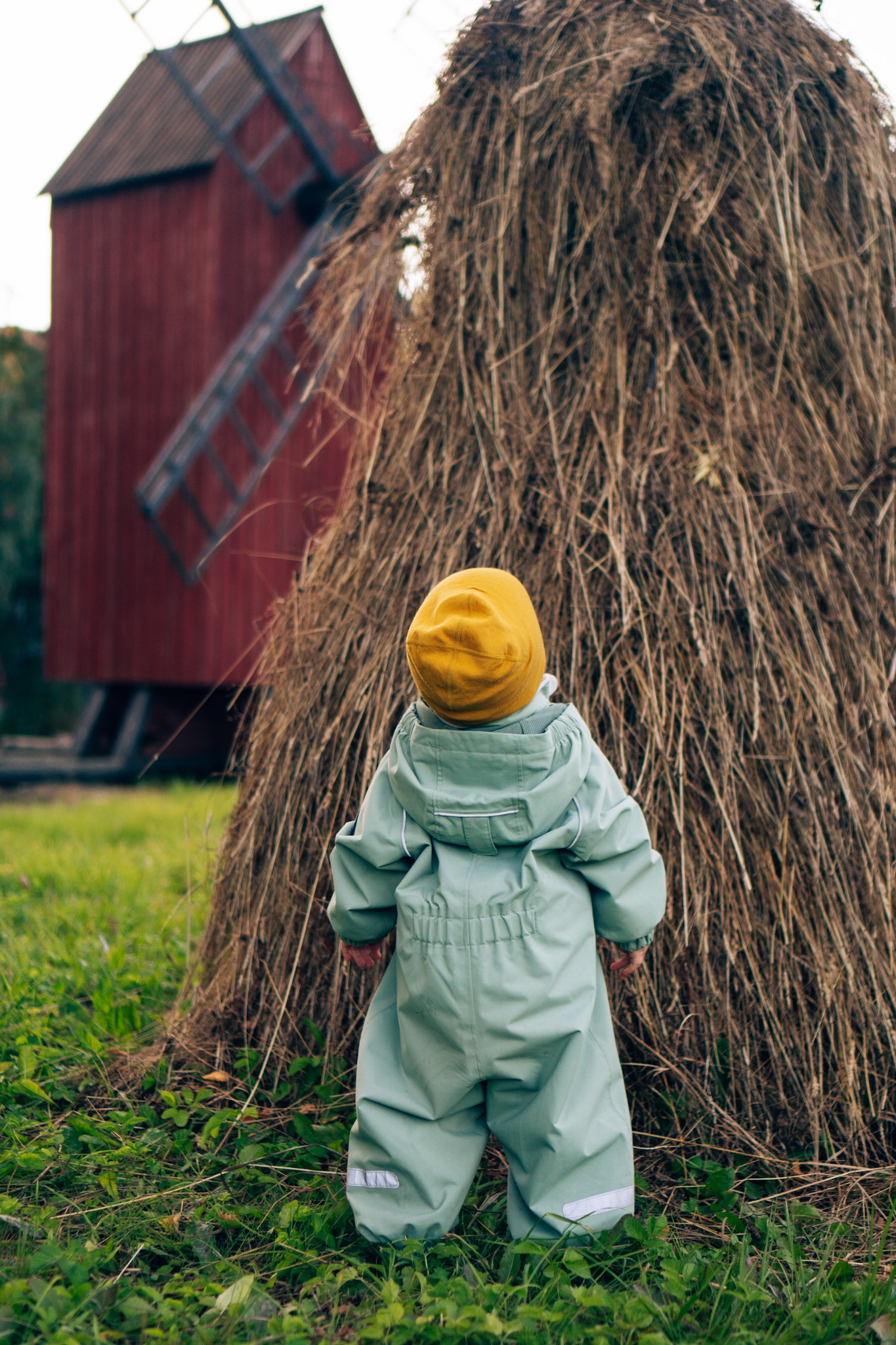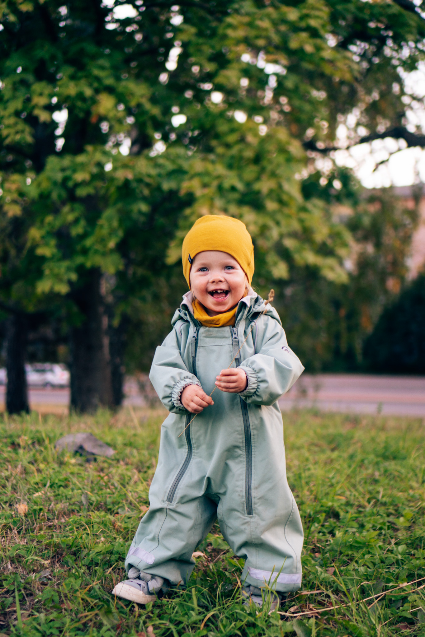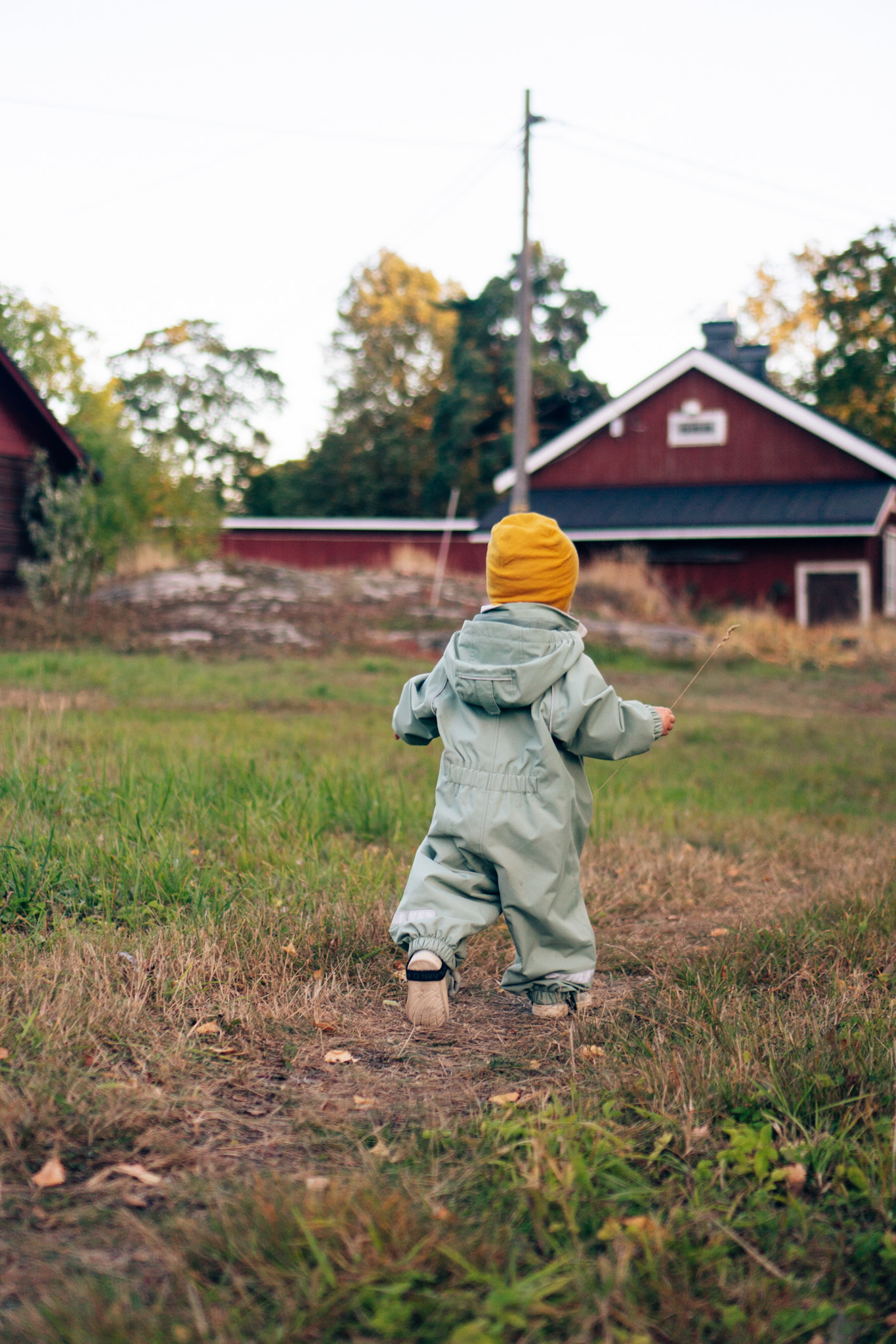 Syksyn tekemisissä suuressa roolissa on ulkovarustus. Jos välikausivaatteet eivät ole varpaista päähän kunnossa, on parempi katsella sisäaktiviteetteja. Suomen syksy on sateinen, tuulinen ja yleensä melko viileä. Tänä vuonna ollaan koettu super lämpimiä päiviä vielä näin syyskuussakin, mikä on sekoittanut ainakin meidän perheen ajatusmaailman pukeutumisesta. Vaikka mittari näyttää 20 astetta auringossa, aivot kuitenkin toitottavat, että nyt on syyskuu! Kuorivaatteet ovatkin sujahtaneet aika usein Saagalle päälle. Näillä lämpimillä keleillä ollaan koettu hyväksi ratkaisuksi pukea kuorihousut jalkaan ja ottaa takki vaunuihin mukaan. Lämmin college- tai merinohaalari on oiva valinta kuorihousujen alle. Tarpeen tullen varjoon siirtyessä mukana on joko kuori- tai windfleece-takki odottamassa.