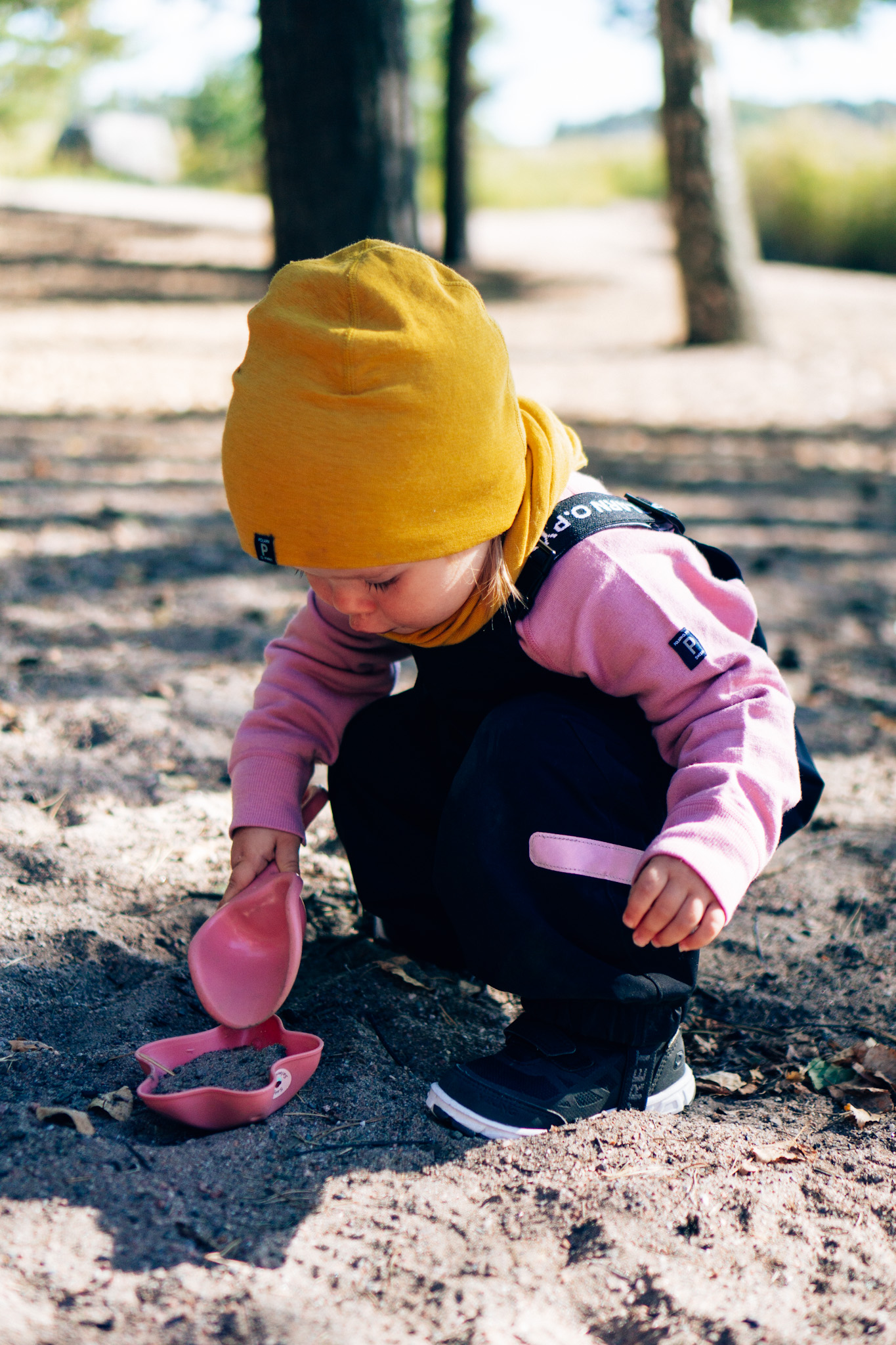 Päiväkodissa käytössä on aina vettä pitävä PO.P:in kuorihaalari. Päiväkodista on suoraan toivottu haalaria, joten sillä mennään. Haalarin Saaga osaa myös jo puoliksi itse pukea! 😊 Käsistä löytyy kuorihanskat ja meidän jo viime syksynä käytössä ollut merinohuivi- ja pipo ovat täydellisiä edelleen.