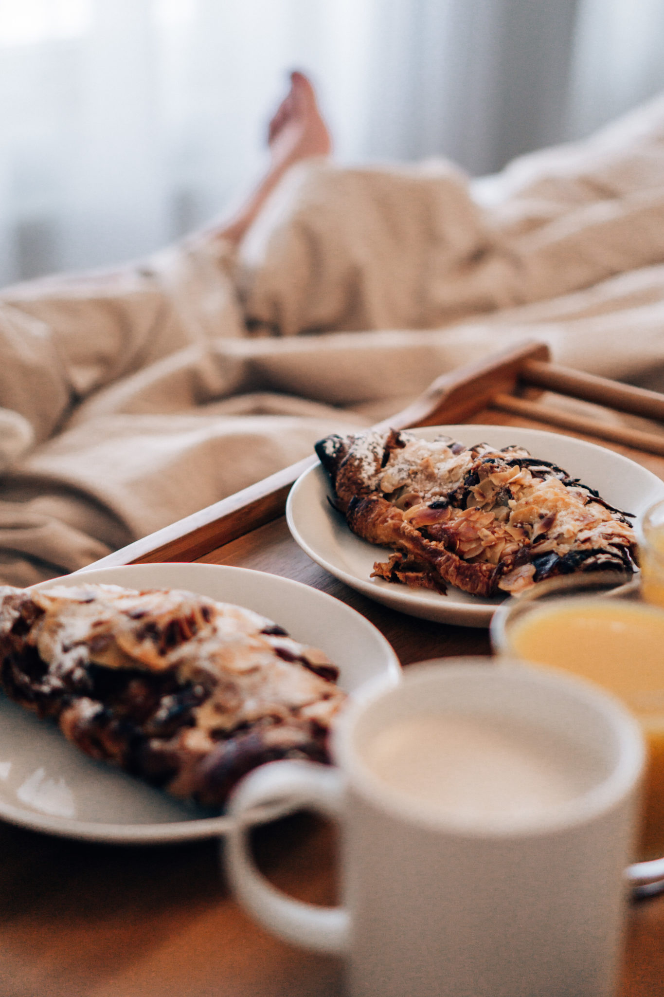 Vien kahvit ja croissantit sänkyyn tarjottimella ja Markus on ottanut Saagan kainaloon makoilemaan. Saaga repii sormillaan Markuksen partaa ja Markus hymyilee. Lasken aamupalan sänkyyn ja Saaga innostuu, kun näkee mun kasvot. Syödään kaikessa rauhassa aamupalat ja juodaan kahvit. Jutellaan Markuksen kanssa yleensä Saagasta, meidän tulevasta muutosta, sisustuksesta tai päivän ohjelmasta. Välillä haaveillaan ja puhutaan lottovoitosta tai talon rakentamisesta. Parasta on se kiireettömyys, läsnäolo, hymyjen määrä ja tietysti se aamukahvi!